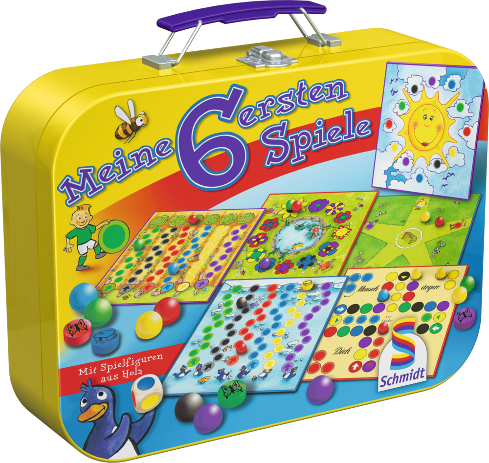 Jetzt im Metallkoffer! Eine lustige Spielesammlung, bei der auch schon die ganz Kleinen eine Menge Spaß haben. Unter den 6 verschiedenen Farbwürfel- und Geschicklichkeitsspielen gibt es natürlich auch ein MENSCH ÄRGERE DICH NICHT in einer kindgerechten Farbversion.