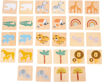 Auf Safari im Kinderzimmer! Bei diesem Memo-Spiel sind Konzentration und Erinnerungsvermögen gefragt, um die 14 gleichen Bildpaare aufzudecken. Die kindgerecht gestalteten Holztäfelchen zeigen niedliche Safari-Motive in Trendfarben, sodass Kinder Schritt für Schritt in die abenteuerliche Welt wilder Tiere eintauchen. Die Kleinen trainieren beim Spielen so nicht nur spielerisch ihr Gedächtnis, sondern lernen auch die Bewohner der Savanne kennen. Damit Kinder auch unterwegs nicht auf ihr Lieblingsspiel verzichten müssen, lässt sich das Gesellschaftsspiel kinderleicht in der passenden Holzbox verstauen und mitnehmen.