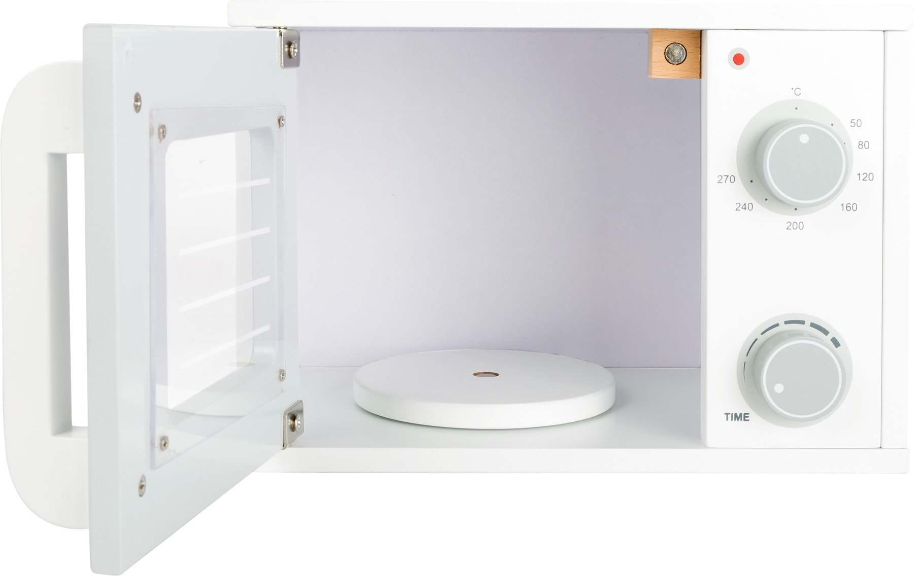 Ping… das Essen ist fertig! Mit dieser Spiel-Mikrowelle aus Holz ist das vorbereitete Essen im Nu warm gemacht und zubereitet. Realistisches Spielvergnügen bieten der Drehteller und die von einem Magneten gehaltene Tür. Die Temperatur- und Zeiteingaben lassen sich ganz einfach durch drehbare Knöpfe einstellen. Ein praktisches Haushaltsgerät, das in keiner modernen Kinderküche fehlen darf. Eine ideale Ergänzung für alle Kinderküchen.