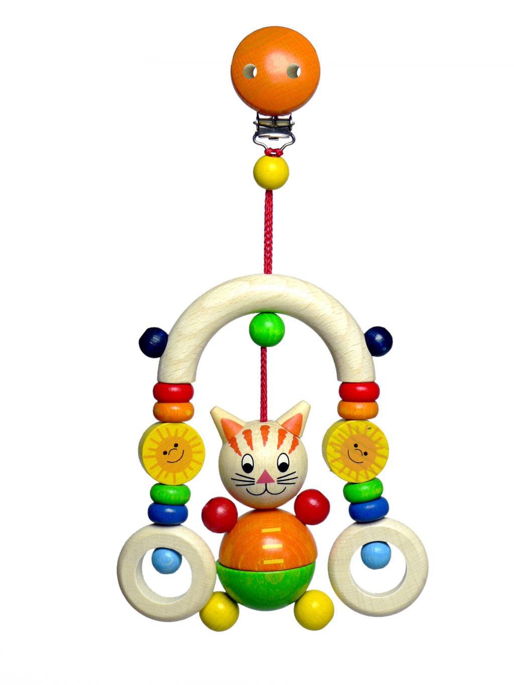Schönes farbenfrohes Trapez aus Holzelementen für Kinderwagen oder Bettchen.