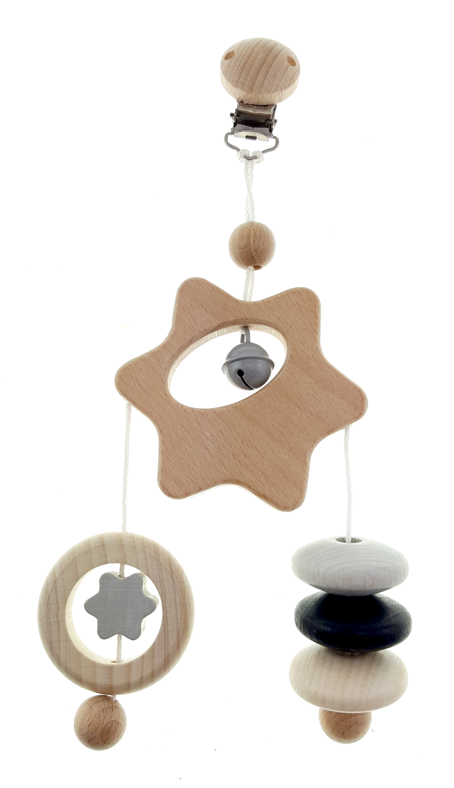 Dieses schönes Trapez aus Holzelementen in trendiger Farbgebung für Kinderwagen oder Bettchen schult den Tastsinn ihres Babies. Das kleine Glöckchen kling sanft beim Berühren.