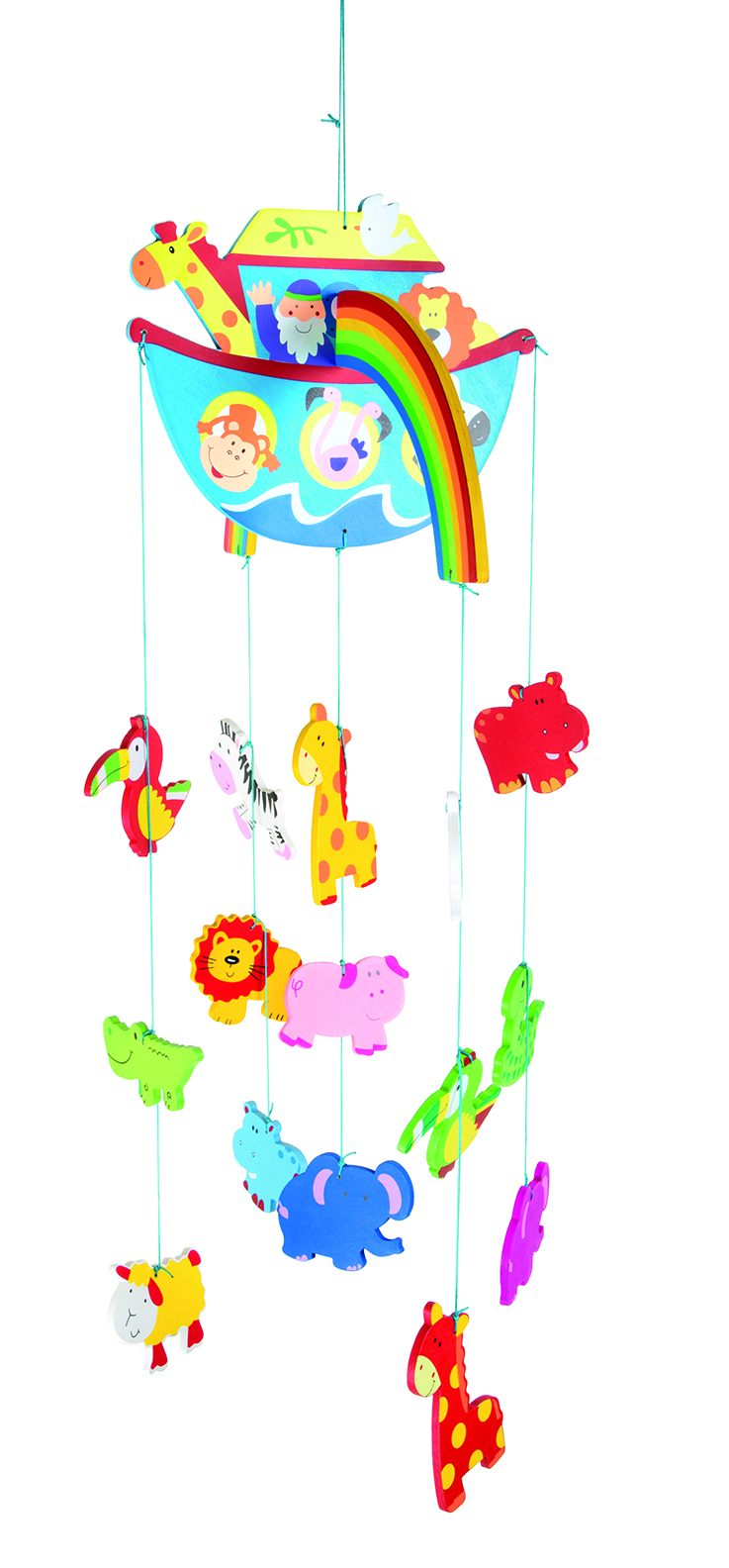 Die Arche Noah und die verschiedenen Tierarten wecken die Neugierde des Babys und animieren zum Strecken und Greifen.Eine schöne, bunte Bereicherung für das Kinderzimmer ist dieses Holzmobile. Die Motorik wird ganz nebenbei gefördert.