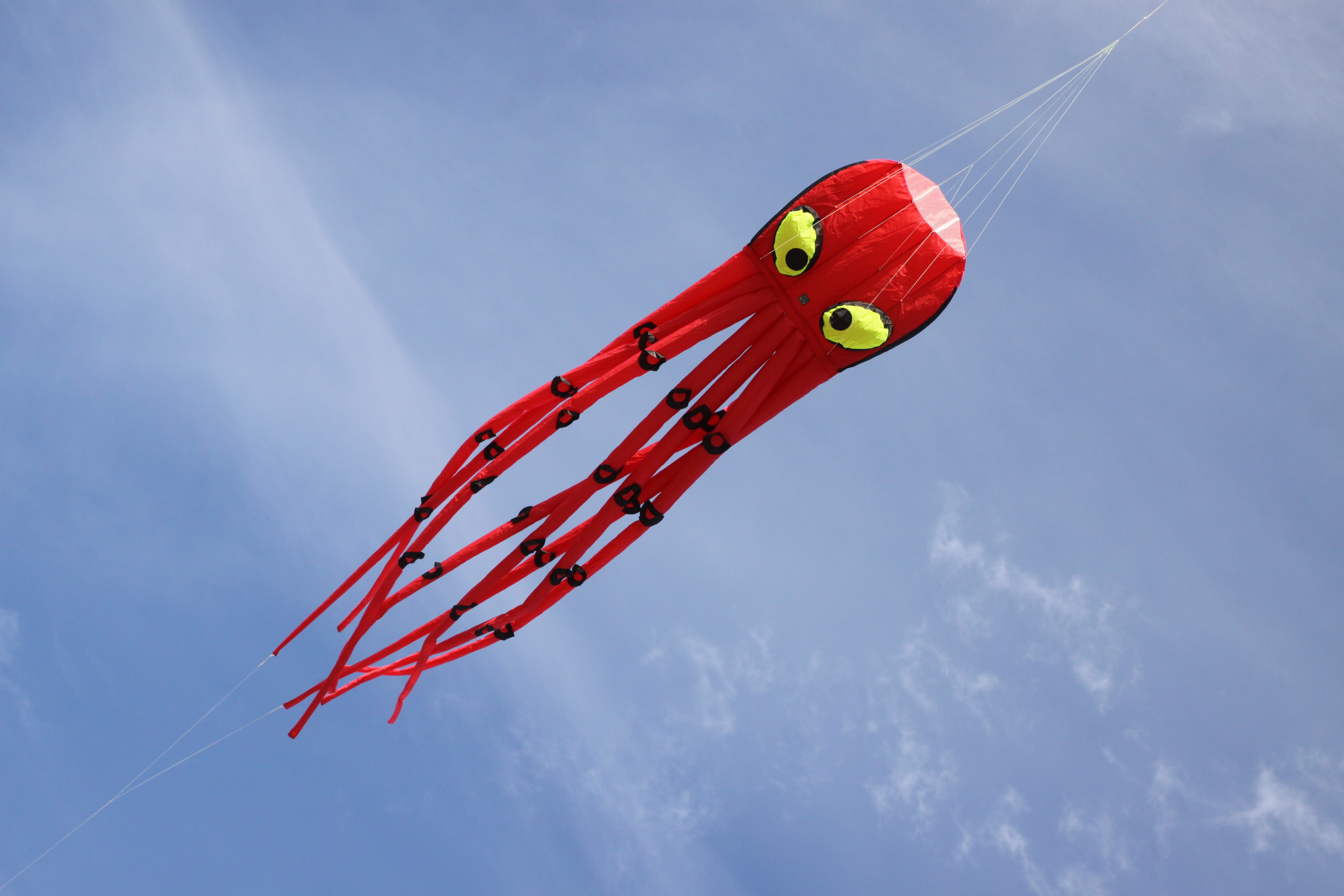Dieser große Einleiner Drachen trägt den Namen „Otto the Octopus“ und gehört zu den roten Kraken innerhalb der Gruppe der Tintenfische. Das witzige Meerestier sorgt mit seinen acht Armen und seiner Gesamtlänge von insgesamt 2,5 m sowie einer Spannweite von 50 cm für Aufsehen am Himmel. Zusätzlich ist der Oktopus mit einem 90 cm langen Schleppsack in Form eines Piranha Fisches ausgerüstet. Dieser dient dazu, dass der Oktopus auch bei mehr Wind stabil in der Luft fliegt. Der Drachen besteht aus stabilem Spinnaker Polyester und ist besonders robust. Eine weitere Besonderheit dieses 3D Drachens ist, dass er ganz ohne Gestänge auskommt und kinderleicht an einer Leine geflogen werden kann. Wir empfehlen den Drachen Kindern ab 6 Jahre. Die Handhabung des Kinderdrachen ist selbsterklärend, ziehe Deinen Drachen aus dem praktischen Zugbeutel, befestige Deine Flugleine am Waagesammeltampen und wickele die mitgelieferte 40 Kp zugkräftige 100 m lange Polyesterschnur auf der Spule nach und nach im Wind ab. Gegebenenfalls kannst Du Deinen Otto the Octopus mit einem zusätzlichen Bodenstecker bzw. Groundstick, den Du in unserem Drachen Online Shop als Zubehör bestellen kannst, am Boden sichern, sodass Dein Einleinerdrachen weiterhin und allein am Himmel fliegt. Der Oktopus kommt flugfertig und praktisch für den Urlaub verpackt, in einer kleinen Tasche zu Dir nach Hause. Er fliegt in einem Windbereich von 2-5 Bft. und ist nicht nur als Drachen an einer Leine zu verwenden. Du kannst ihn auch als Leinenschmuck für zugkräftige Parasled Drachen umbauen, indem Du die Flugleine vom Drachen entfernst und ihn mittels eines Aluwirbels in Deine Zugdrachenleine hängst. Neben unserem „Otto the Octopus“ 3D Dachen haben wir auch noch andere Parafoil Tierdrachen, wie unseren Waldrachen „Willi the Whale“ und den beliebten Froschdrachen „Fritz the Frog“ in unserem Sortiment.