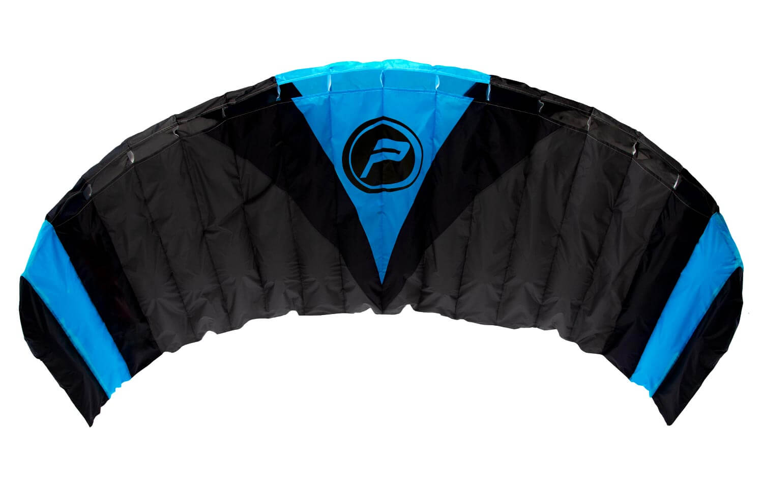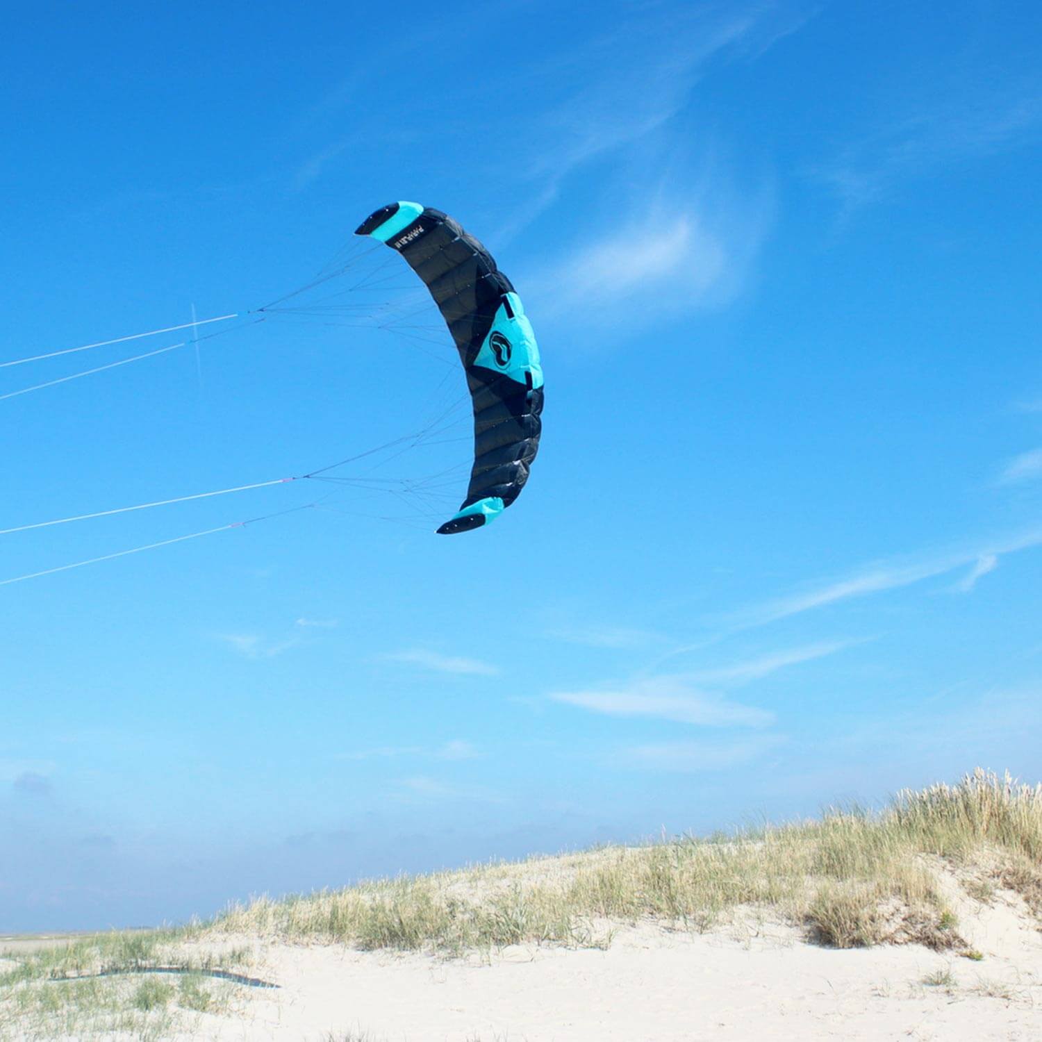 Die Paraflex Quad 3.9 kennzeichnen ihre 18 Zellen. Die Spannweite beträgt damit 360 cm bei einer Fläche von 3,9 m², damit ist der Vierleiner der zweitgrößte unserer Quad-Reihe und ist mit viel Speed und Power stabil am Himmel unterwegs. Daher empfehlen wir diese Quad-Matte erst Piloten ab 12 Jahren, die die ordentliche Zugkraft der Matte handeln können. Die Quad 3.9 aus der Paraflex Reihe ist ein absoluter Allrounder unter den Actionkites: Du kannst sie bei wenig Wind am Strand fliegen oder sie zum Buggy fahren nutzen. Auch für das Fahren auf einem ATB Board sowie zum Snowkiten im Winter ist die starke Lenkmatte super geeignet. Am besten lässt sich die blau-schwarze 4 Leiner Matte bei Windstärke 2 - 6 Bft. fliegen und per Zweileiner-Lenkbefehle steuern. Zusätzlich lassen sich die Bremsleinen einsetzen, wodurch sich Drehungen enger fliegen lassen. Die Paraflex Quad kannst Du ebenfalls vom Boden aus rückwärts starten und kontrolliert landen.