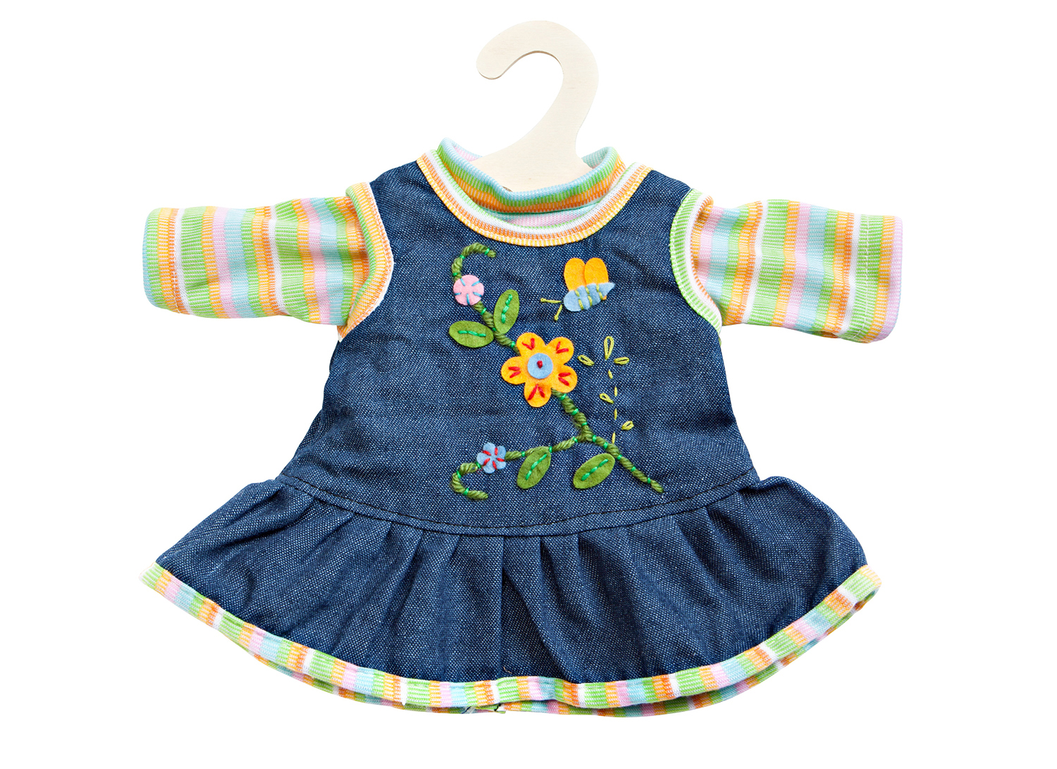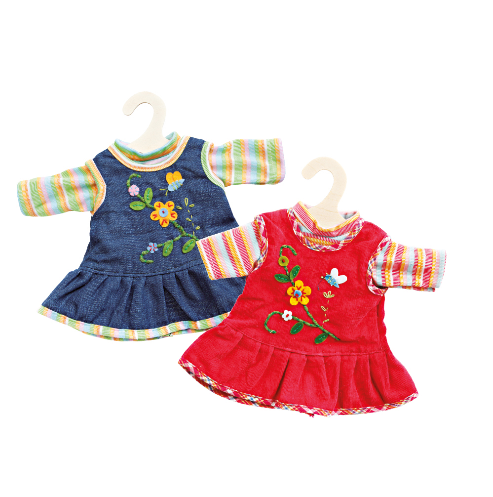 Das peppige Kleid von Heless sorgt für gute Laune unter den Puppen-Blumenmädchen. Beide Versionen des Kleids sind mit aufwändiger Applikation bestickt und einem farbigen Saum versehen. Das rote Cord-Kleidchen verfügt über ein langärmeliges, gestreiftes T-Shirt in rot-orange Tönen, das blaue Kleid in Jeansoptik über ein Shirt mit gelb-grünen Streifen. Dieses Kleid passt den meisten marktgängigen Puppen der Größe 35 - 45 cm. Es ist auch in einer weiteren Ausführung für Puppengröße 28 - 35 cm erhältlich. Der Artikel wird auf einem Holzkleiderbügel geliefert.