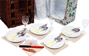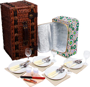 Perfekt ausgerüstet für ideale Sommervergnügen bei festlichem Essen im Freien! Mit Geschirr, Besteck und Weingläsern für vier Personen bestückt, sowie mit Holzbrett, Kellnermesser, Servietten, Salz- und Pfefferstreuer, wird die kleine Tafel im Grünen stilvoll arrangiert. Der wunderschöne Weidenkorb mit stabilem Tragegriff hält die Teile an Klettbändern sicher fest und eine herausnehmbare Kühltasche hält Speisen und Getränke wohl temperiert.