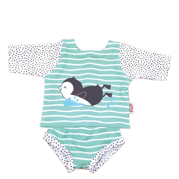Plitsch, platsch, jetzt wird's nass. Mit dem neuen Pinguin-Puppenschwimmset von Heless macht das Badeabenteuer gleich noch mehr Spaß. Das Set besteht aus Schwimmring, Schwimm-Outfit und Badeschlappen und ist durch seine neutralen Farben und das niedliche Design sowohl für Puppenjungs wie Puppenmädchen geeignet. Das fröhliche 2-teilige Schwimm-Outfit mit "Pinguin Pünktchen"-Print ist aus elastischem Spandex-Material gefertigt. Es trocknet schnell, lässt sich kinderleicht an- und ausziehen und schützt die Puppe ganz vorbildlich vor zu viel Sonne. Um sicher über jede Welle zu gleiten, kann sich die Puppe in den Pinguin-Schwimmreif setzen. Die trendigen Badelatschen sind das Tüpfelchen auf dem i. Ein cooles Set für den nächsten Abstecher ins Meer, den Pool oder die Badewanne. Dieses Set passt den meisten marktgängigen Puppen der Größe 35 - 45 cm.