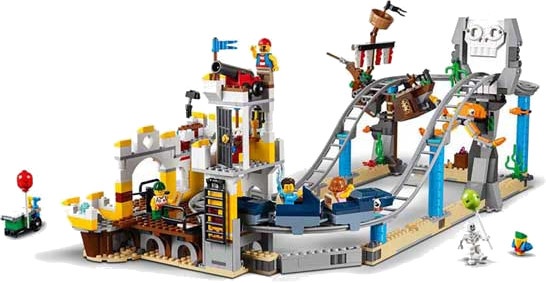 Bist du bereit, ein Ticket am Tresen für eine wilde Fahrt in der LEGO Creator Piratenachterbahn zu kaufen? Setze Dich in den Haiwagen und halte Dich fest, wenn es los geht. Bücke Dich, um dem Schädel auszuweichen, beuge dich entlang der Biegung über der versunkenen Galeone und halte Ausschau nach der Wasserkanone, während du durch das Wasser saust und planst. Vergiss nicht, in die Kamera zu lächeln! Nach vielen Fahrten in der Achterbahn kannst du das Set umbauen und deine lustigen Abenteuer auf der Schädeldecke fortsetzen oder das coole Schaukelschiff ausprobieren!