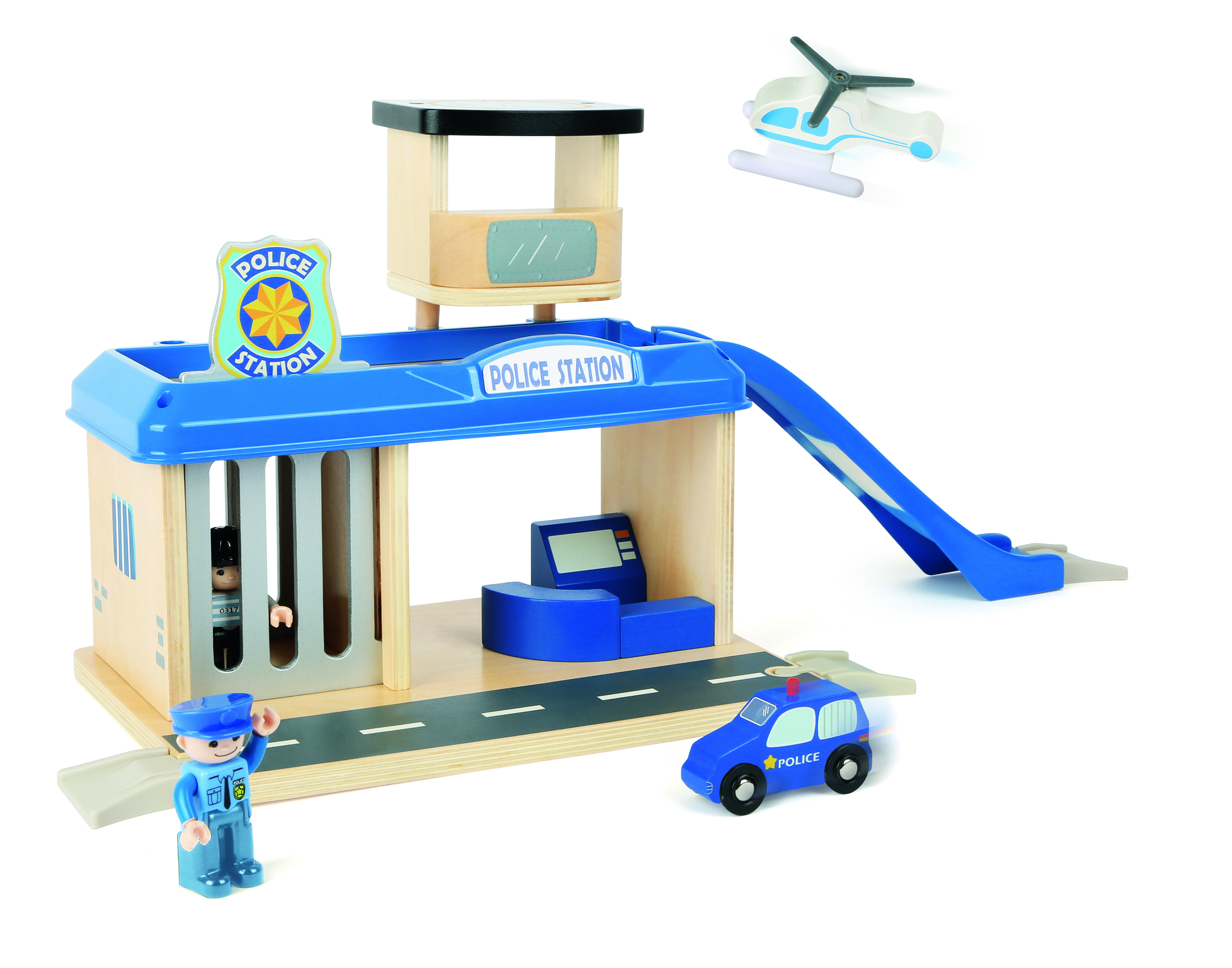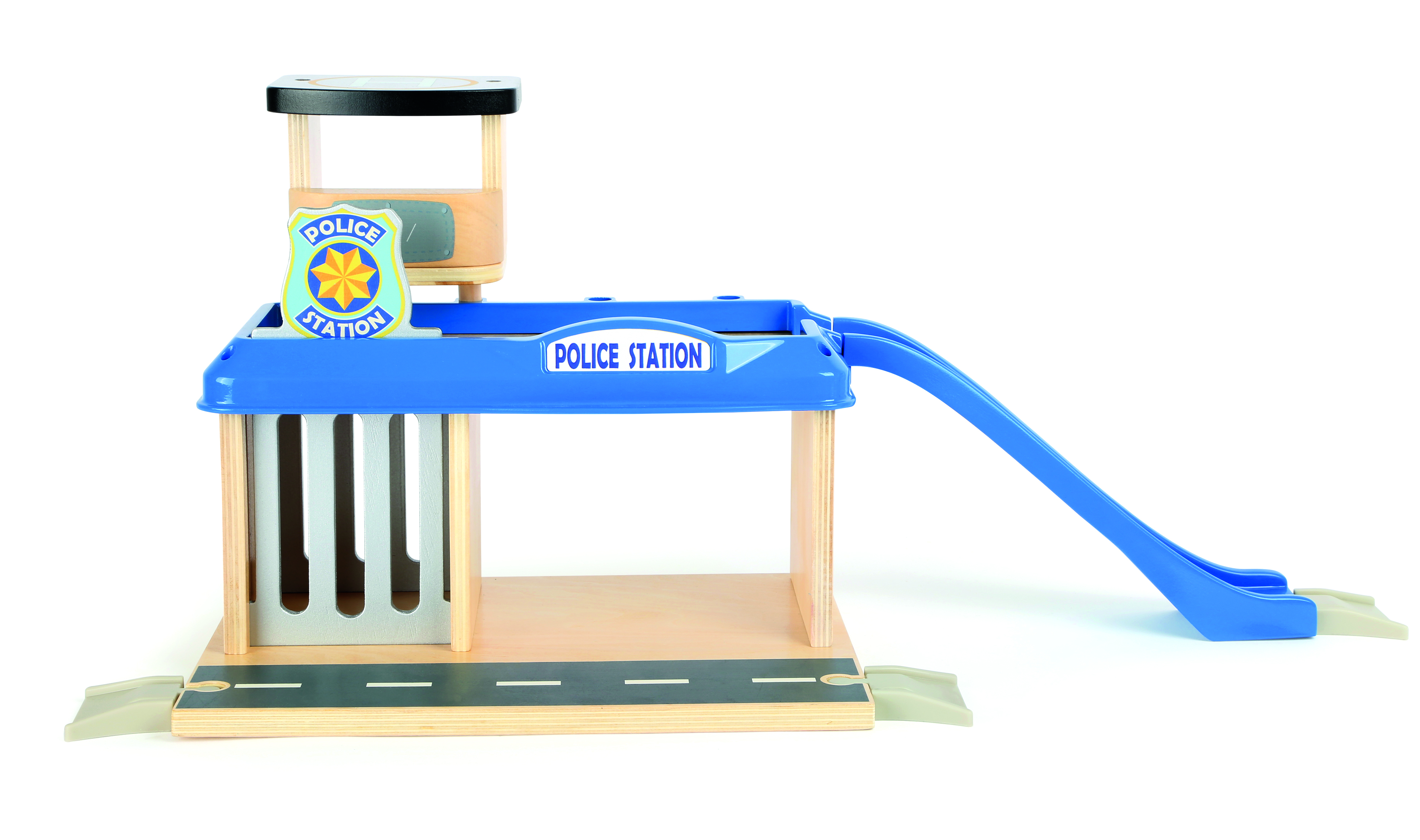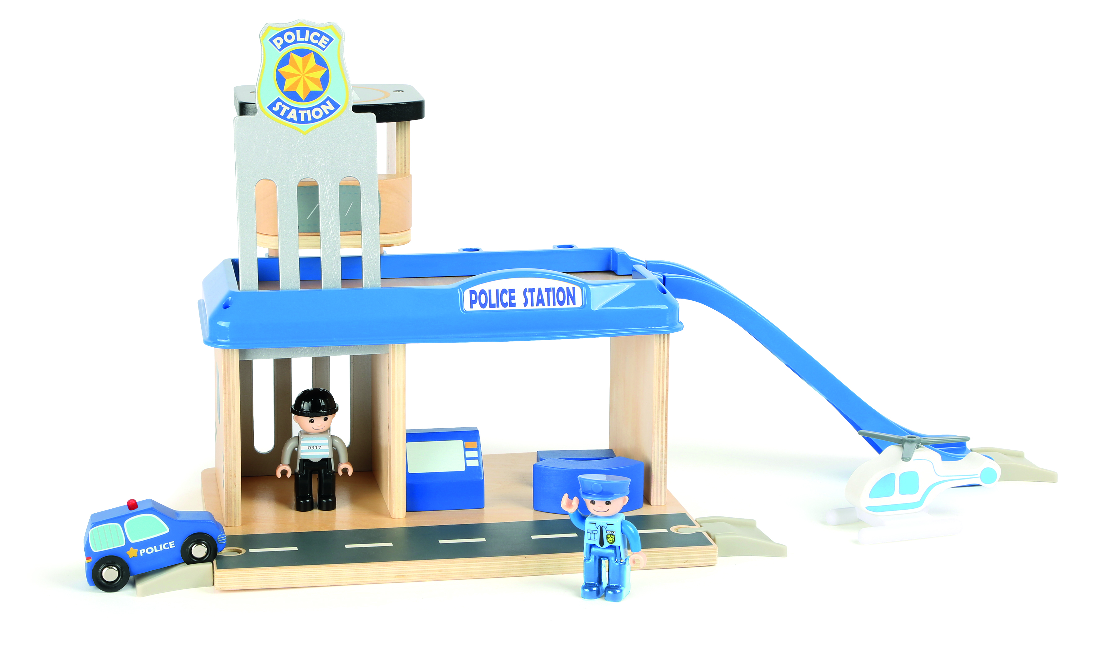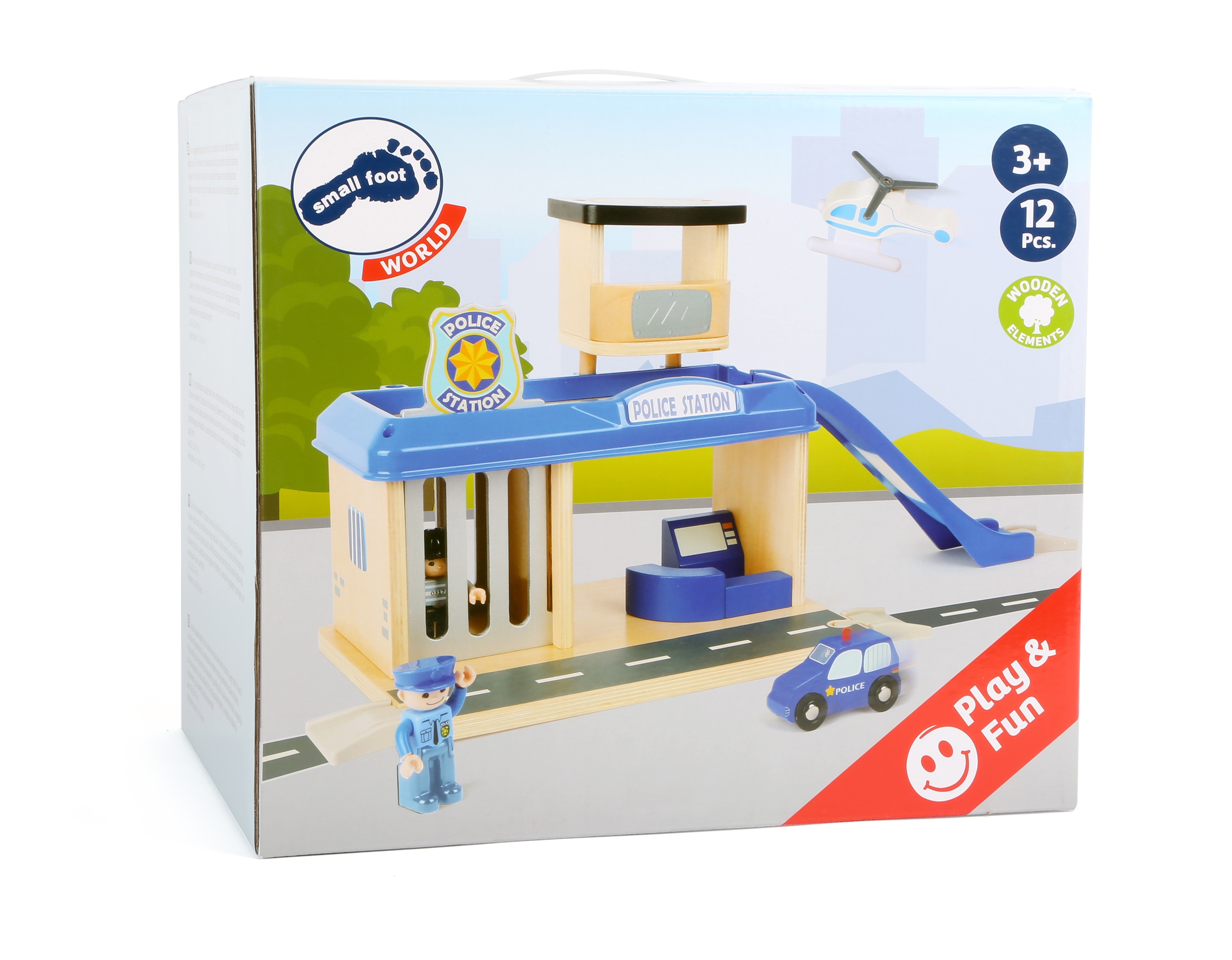 Hier ist was los! Auf dieser Polizeiwache aus unserer small foot world-Spielwelt ist Action garantiert! Die Kombination aus FSC® 100%-zertifiziertem Holz und stabilen Kunststoffelementen bietet jede Menge Zubehör für größere und kleine Polizistinnen und Polizisten, um auf der Polizeistation ihrer Fantasie freien Lauf zu lassen. Der Hubschrauberlandeplatz, die Rampe zu den Parkplätzen und eine richtige Gefängniszelle sind die absoluten Highlights! Also auf zum ersten Einsatz: Rase mit dem Polizeiauto die Rampe herunter, lasse den Hubschrauber von seinem Landeplatz abheben und jage den Dieb! Eine wilde Verfolgungsjagd quer durchs Kinderzimmer beginnt, aber am Ende landet der Räuber immer da, wo er hingehört: in der Gefängniszelle! Die Polizeiwache lässt sich toll mit den anderen small foot world-Produkten kombinieren und garantiert spannenden, abwechslungsreichen Spielspaß!