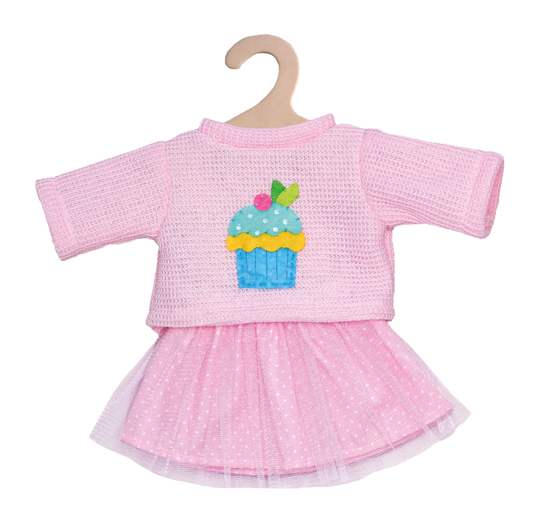 Dieses niedliche, farbenfrohe Puppen-Bekleidungsset von Heless bestehend aus Tüllrock und Pullover sprüht vor guter Laune. Es ist in drei verschiedenen Farbmodellen erhältlich, die allesamt über eine hochwertige Cupcake-Applikation verfügen. Die gepunkteten Röcke sind mit Tüll überzogen und bieten einen tollen Stoffkontrast zum dazugehörigen Pullover in Strickoptik. Dieses Set passt den meisten marktgängigen Puppen der Größe 28 - 35 cm. Es ist auch in einer weiteren Ausführung für Puppengröße 35 - 45 cm erhältlich. Der Artikel wird auf einem Holzkleiderbügel geliefert.