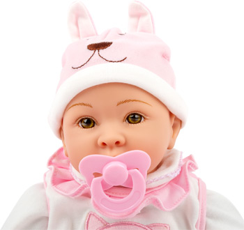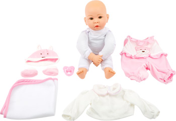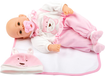 Emilia, die Puppe zum Verlieben! Die kleine Puppe Emilia will einfach umsorgt werden! Mit Nuckelflasche, Lätzchen und Strampelanzug macht Emilia einen niedlichen Eindruck und lässt Kinderaugen strahlen! Zum Heulen süß ist unsere kleine Puppe „Emilia“ mit ihrer Wolfsmütze und passendem rosa Strampler. Schmusedecke und Fläschchen hat sie dabei und kann sofort bei kleinen Muttis und Vatis einziehen.