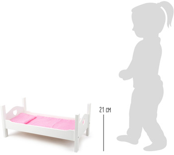 Hier fällt es keiner Puppe schwer, ins Bett zu gehen. Dieses moderne Puppenbett aus Holz mit entzückenden Herzmotiven lässt Puppenträume wahr werden. Hier lernen die kleinen Puppenmamas und -papas spielerisch das zu Bettgehen. Das regt nebenbei die Fantasie im kindlichen Rollenspiel an. Das niedliche Bettzeug, bestehend aus Kissen, Decke und Bettlaken, sorgt für eine angenehme Bettruhe. Die hochwertige Verarbeitung bietet langanhaltenden Spielspaß. Eine ideale Erweiterung für die Puppenmöbel-Ausstattung.
