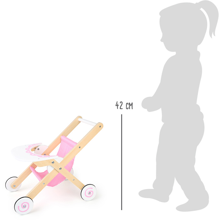 Lass' uns Spazierengehen! Der Puppenbuggy ist aus stabilem Holz gefertigt und überzeugt mit dem gemütlichen Sitz aus Stoff und dem praktischen Tisch. Der Hingucker sind aber die gummibereiften Räder mit witziger Bemalung, die während der Fahrt für tolle Spiraleffekte sorgen und gute Laune machen. Die Gummiringe an den leichtgängigen Holzrädern sorgen nicht nur für leise Laufgeräusche, sondern auch für die seitliche Rutschfestigkeit. Mit diesem niedlichen Puppenwagen kann der nächste Baby- oder Teddy-Ausflug quer durch Haus oder Garten sofort beginnen!