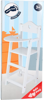 Dieser schlichte Hochstuhl aus Holz lässt Puppenherzen höher schlagen! Weiß lackiert und mit kleinem Herzausschnitt versehen, ist er eine stilvolle Ergänzung für die Puppenausstattung.