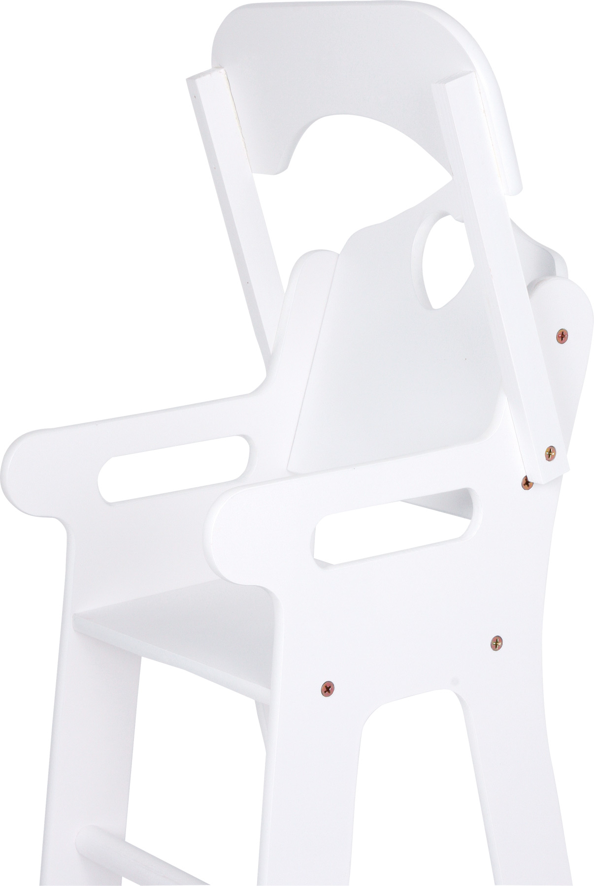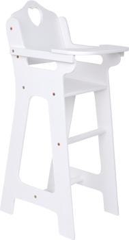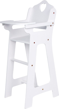 Zu Tisch bitte! Dieser Puppenhochstuhl aus stabilem, weiß lackiertem Holz überzeugt verantwortungsvolle Puppeneltern sofort! Praktisches Highlight ist der klappbare Tisch, der komfortables Ein- und Aussteigen der Puppen und Kuscheltiere ermöglicht. Der Hochstuhl mit dem niedlichen Herz an der Rückenlehne ist eine stilvolle Spielergänzung für die Puppenstube und mit seinen 63 cm Höhe auch für den Esstisch geeignet!