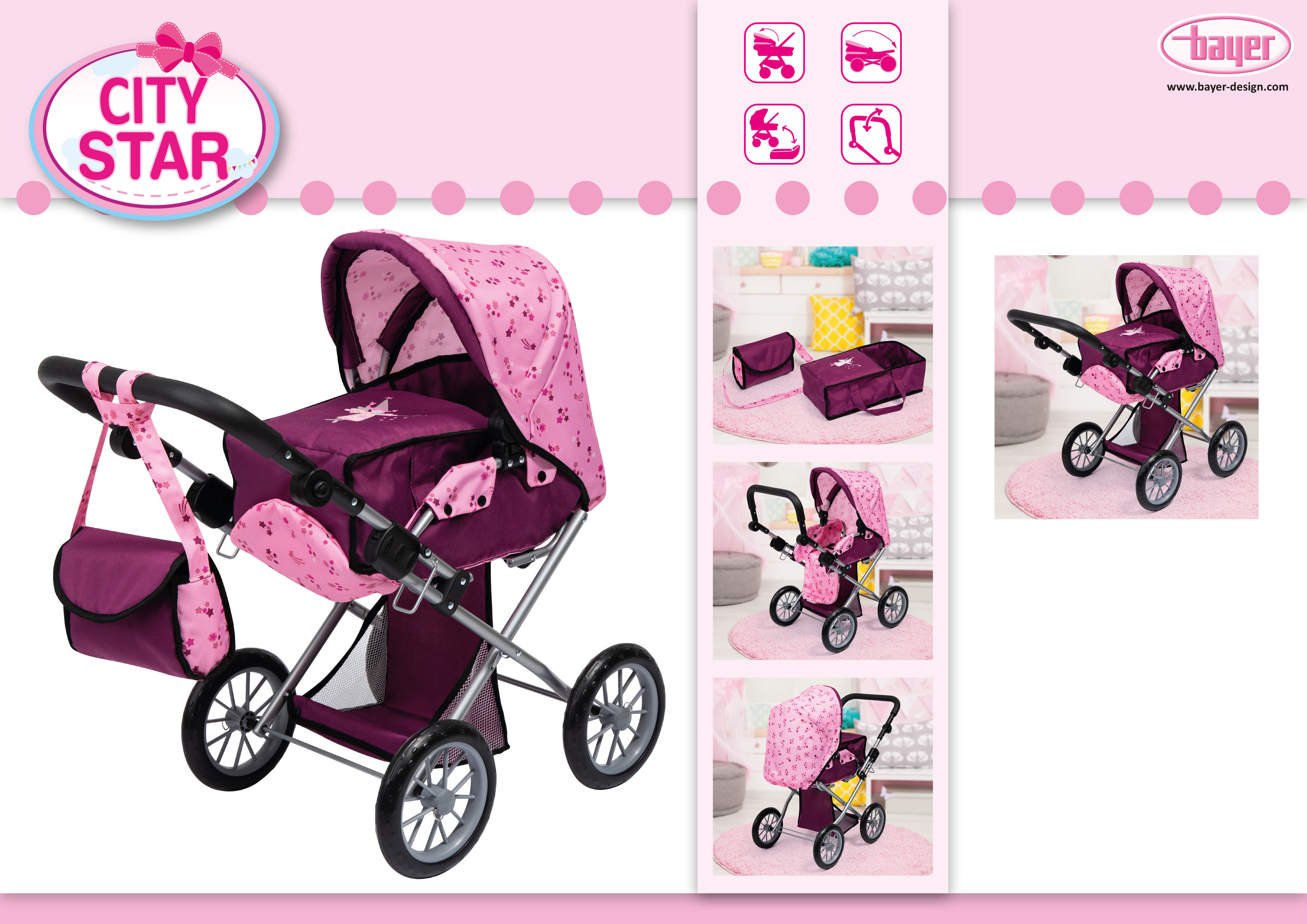 City Star ist ein modischer Kombi-Puppenwagen mit trendigem Design. In die herausnehmbare Tragetasche passen Puppen mit einer Größe von bis zu 46 cm. Durch den höhenverstellbaren Griff 30 - 65 cm kann eine optimale Anpassung auf die Größe des Kindes erfolgen. Der Wagen kann darüber hinaus spielend einfach in einen Sportwagen umgewandelt werden. Durch die großen Räder ist der Wagen besonders geländegängig. Die mitgelieferte Umhängetasche bietet viel Platz z.B. für Puppenutensilien. Zudem ist durch den integrierten großen Korb viel weiterer Stauraum vorhanden.