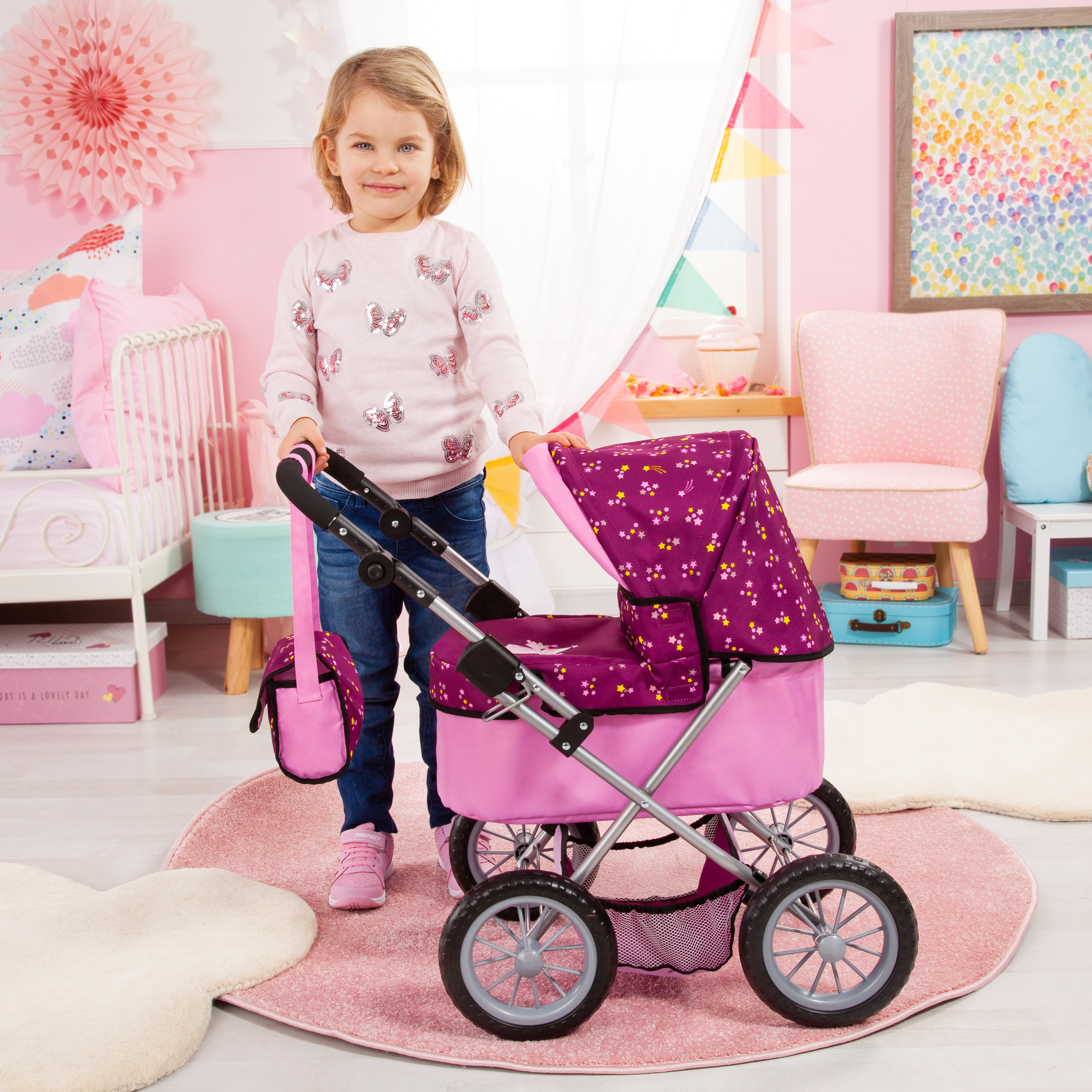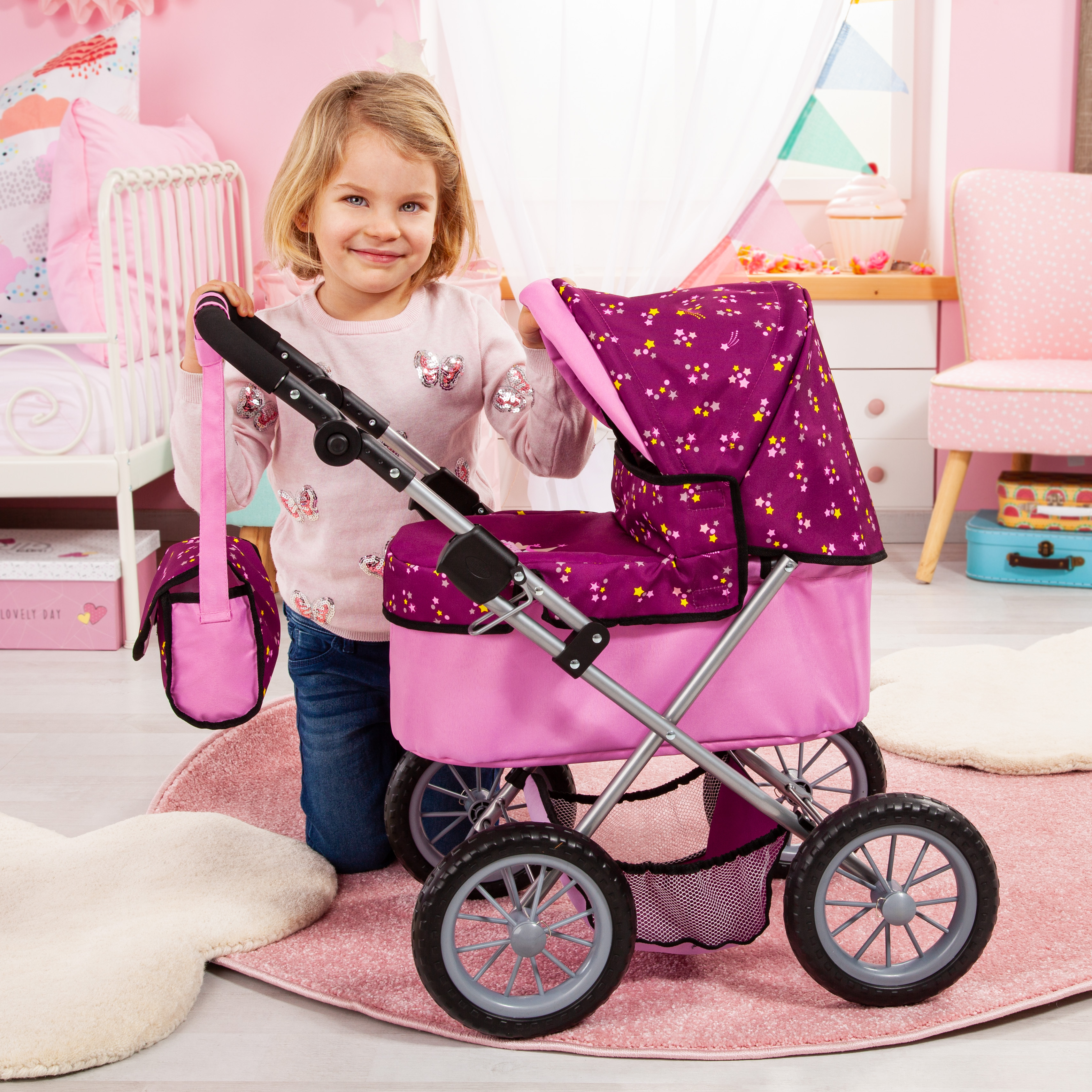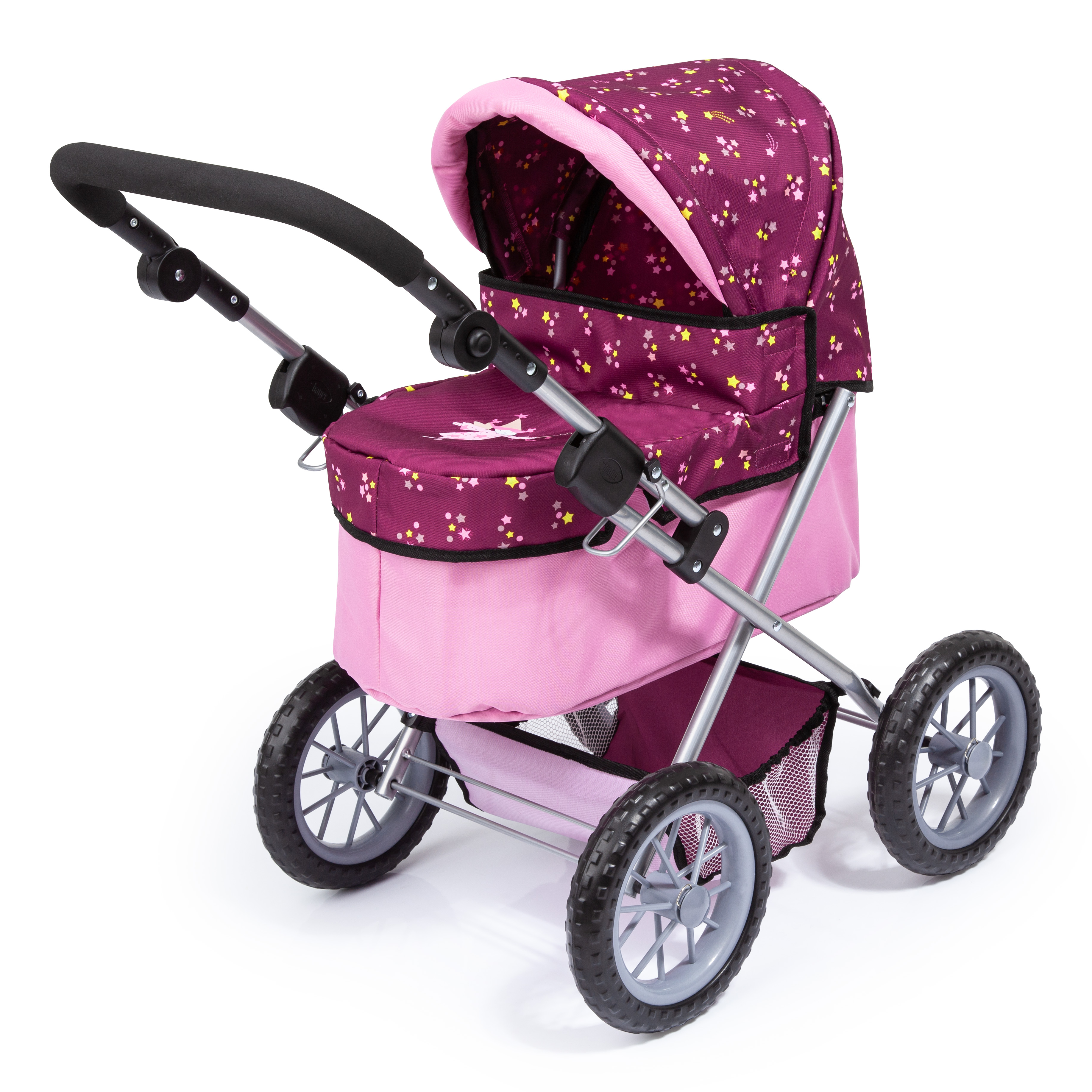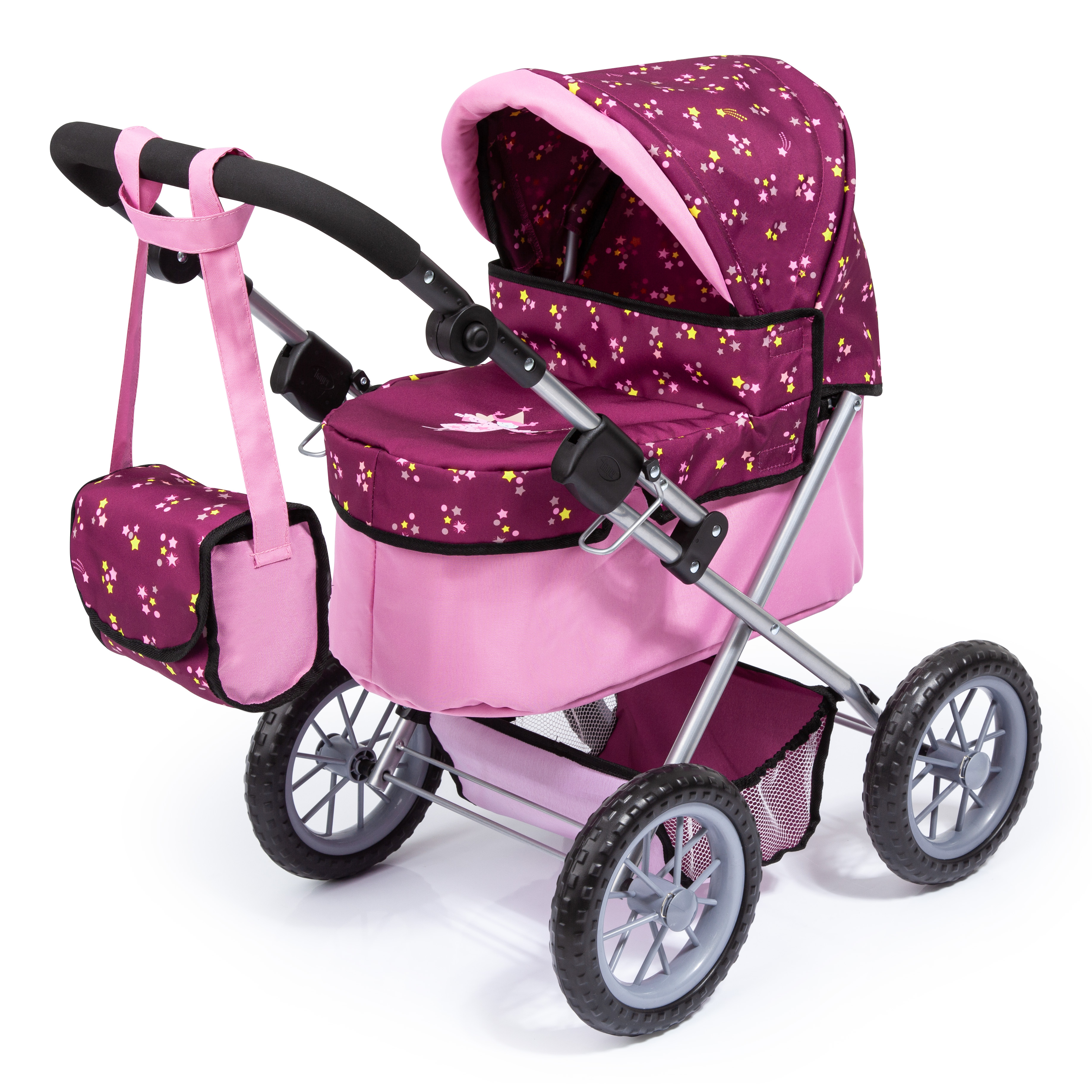 Trendy ist ein schöner Puppenwagen in einer modernen und frischen Farbe und bietet Platz für Puppen bis 46 cm. Beim Trendy ist der Griff von ca. 39 - 68 cm verstellbar und somit optimal auch schon auf die kleinsten Puppenmuttis/-vatis einstellbar. Durch seine vier großen Reifen, ist er perfekt für das Schieben auf unebenen Untergrund geeignet. Da sich der Wagen einfach zusammenklappen lässt, kann man ihn leicht transportieren. Im integrierten Einkaufskorb kann alles mitgenommen werden, was das Kind für einen Ausflug mit der Puppe oder dem Plüschtier benötigt.