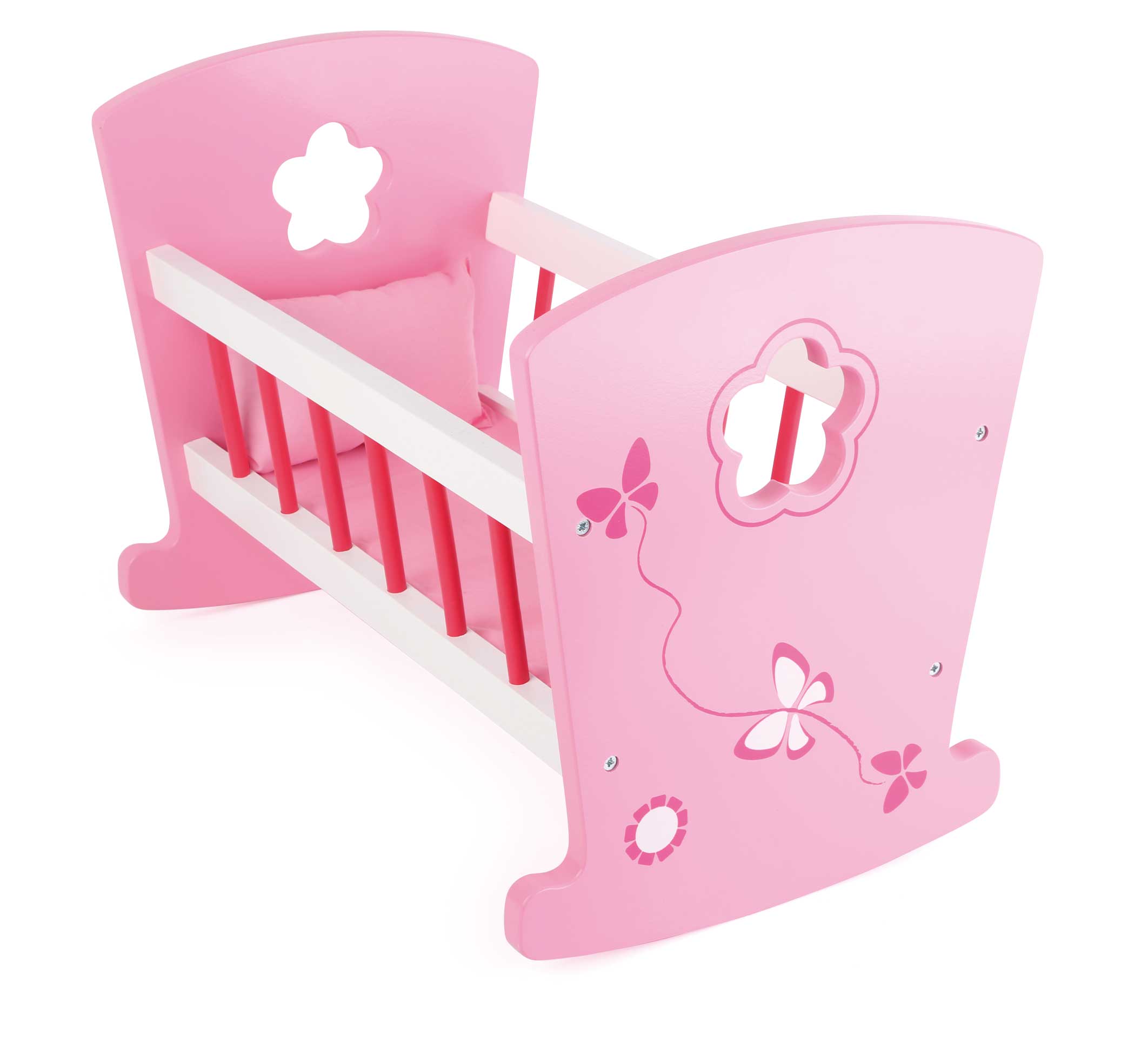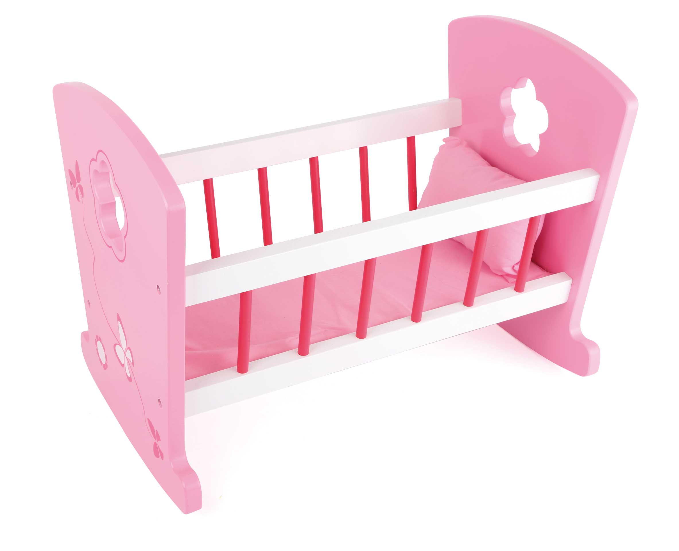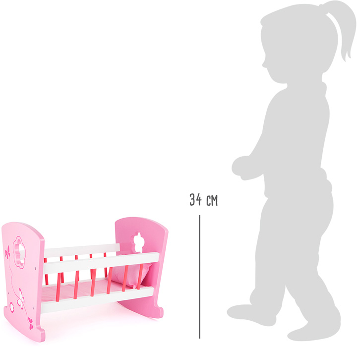 Es ist Schlafenszeit! Mit dieser niedlichen Puppenwiege aus stabilem Holz können Puppen und Kuscheltiere sanft in den Schlaf gewiegt werden. Die Wiege ist liebevoll bemalt und detailreich verziert. Auf dem kleinen Kissen können Puppe und Co es sich so richtig bequem machen, dazu ein Schlaflied und beruhigendes Schaukeln – wer würde hier nicht gern schlummern? Die Puppenwiege ist eine tolle Bereicherung für das Kinderzimmer, über die sich alle Puppenmamas und -papas freuen!