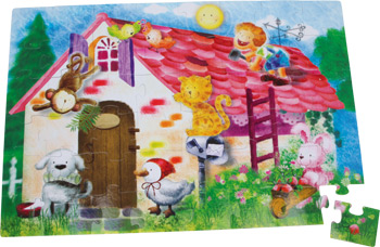 48-teilig. Das ist riesig! Großes Bodenpuzzle in 62 x 92 cm mit Hausmotiv und lustigen bunten Tieren als Bewohner und Gärtner. Aus stabilen Pappteilen.