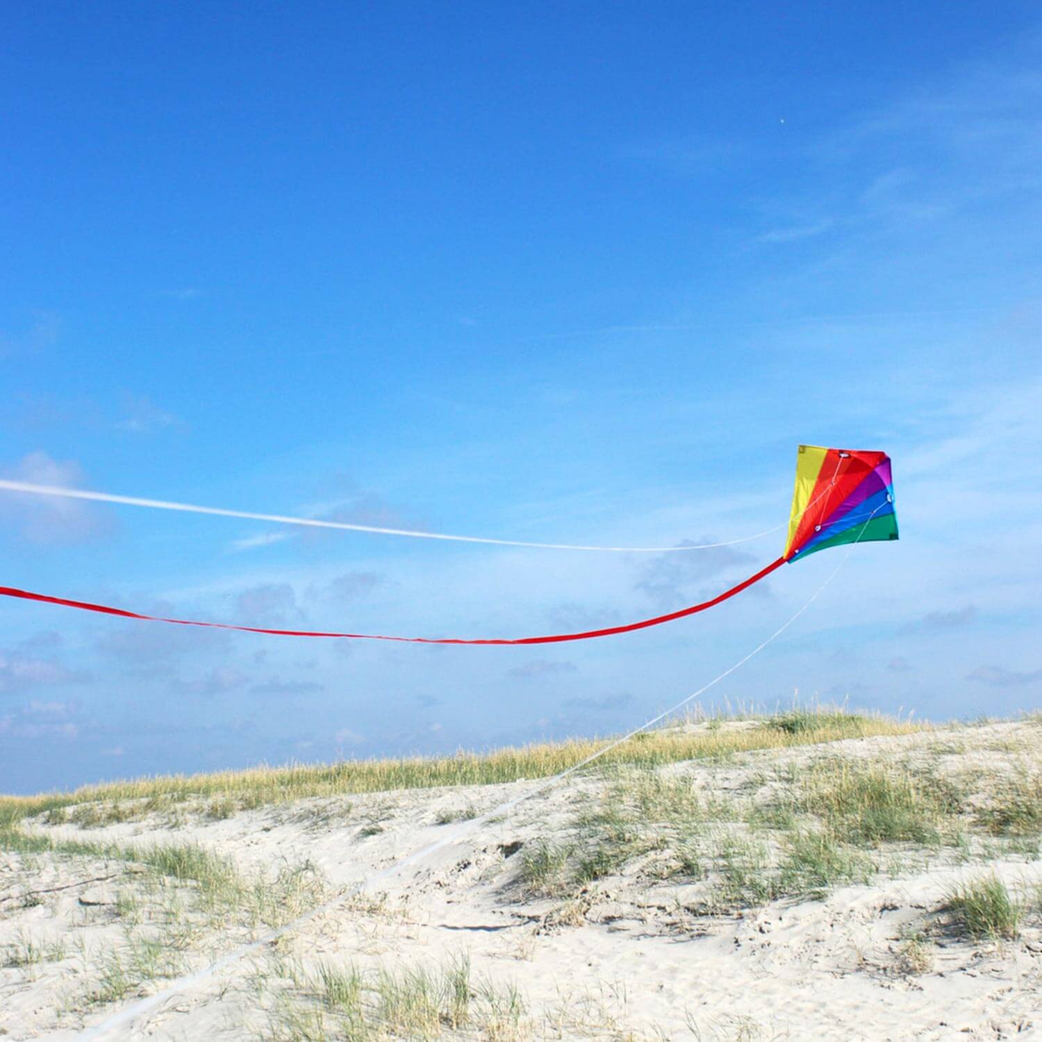 Solltest Du den Drachen an einer Leine fliegen wollen, empfehlen wir Dir für den Umbau der Lenkdrachenflugleine, einen Handgriff mit Schnur der eine Stärke von 25 Kp und einer Länge von 40 m haben sollte. Dieser müsste dann anstelle der zwei Lenkleinen mit beiden Waageringen auf der Vorderseite des Drachens angebracht und befestigt werden. Ein besonders schönes Himmelsbild ergibt sich übrigens, wenn viele dieser Racer Drachen zum Gespannflug miteinander verbunden werden. Ein Highlight, das man nur noch selten zu sehen bekommt. Der Racer in der Regenbogen-Variante wird mit einem 4 mm Glasfasergestänge flugfertig ausgeliefert. Auch ein Drachenschlauchschwanz in der Farbe rot sowie Polyesterleinen mit einer Länge von 2 x 25 m und einer Zugstärke von 25 kp, bereits auf einen praktischer Winder mit Handschlaufen gewickelt, sind im Lieferumfang enthalten. Für das Aufwickeln der Schnüre empfehlen wir beide Schnüre gleichzeitig immer in Kreuz als Acht über den Winder aufzuwickeln, so wird das Material geschont und beim nächsten Abwickeln ein Leinenverknoten verhindert. Der klassische Drachen ist bereits für Piloten ab 5 Jahren geeignet. Übrigens kannst Du unseren Racer auch als Pirat-Variante oder auch als 3er-Gespann bei uns im Online Shop kaufen.