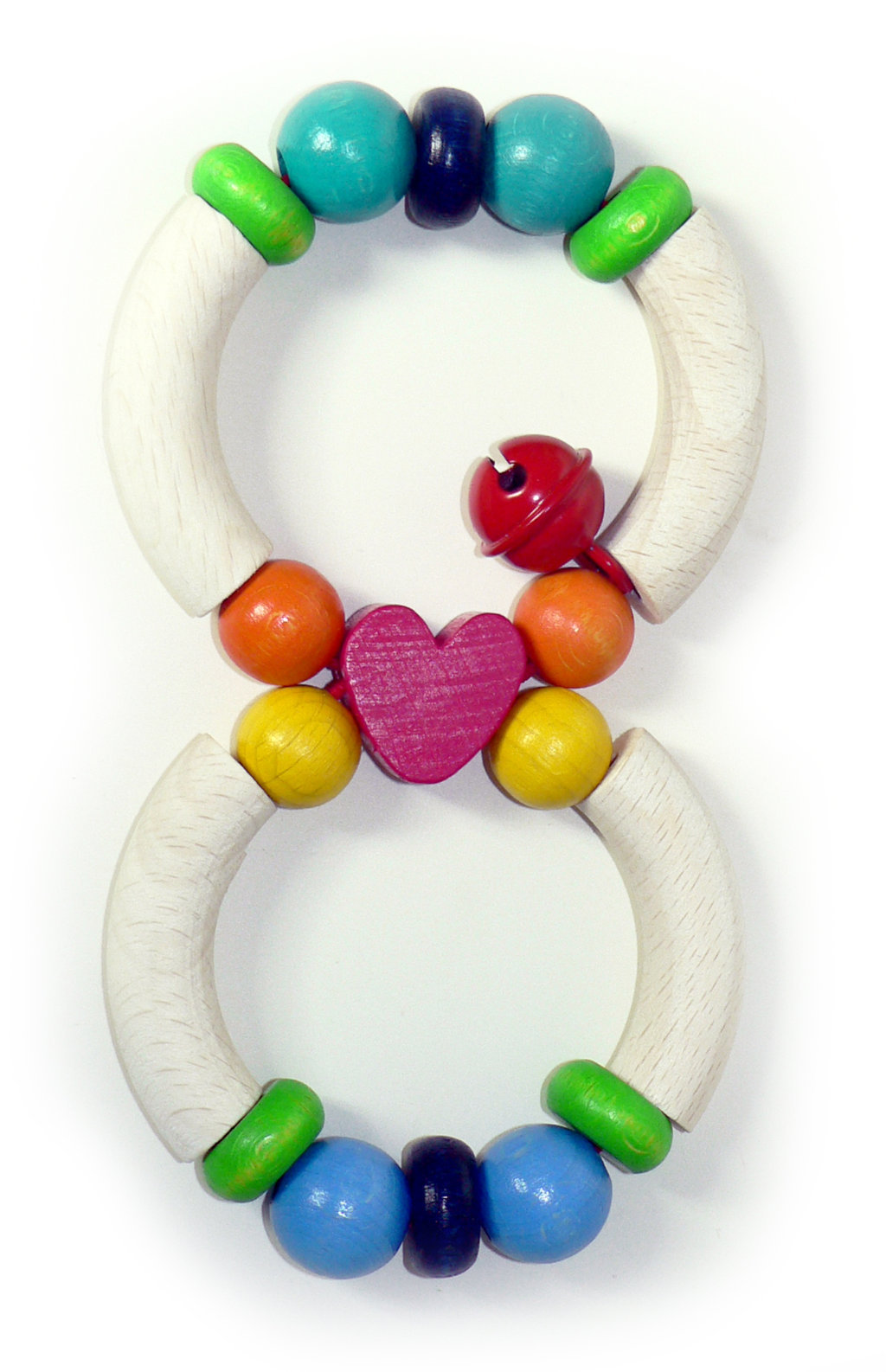 Farbenfrohe und kindgerechte Rassel mit Holzelementen.