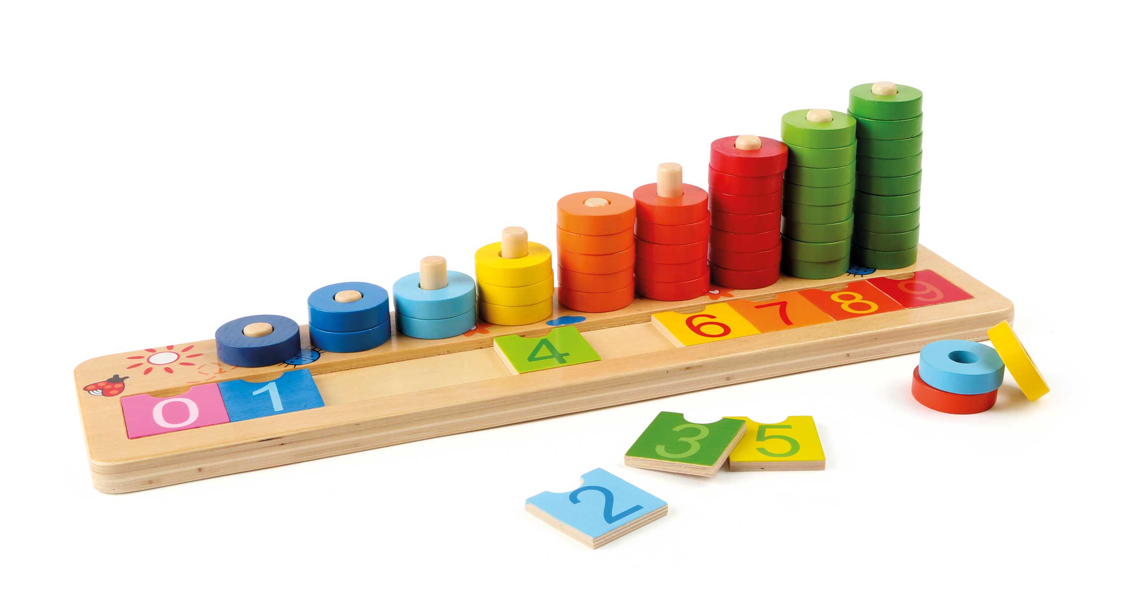 Eine neue Idee zum spielerischen Umgang mit den ersten Rechenaufgaben. Die Holzringe können der Reihe nach in richtiger Anzahl auf den Stäben platziert werden, dann kommen die dazugehörigen Ergebnisplättchen ins Spiel. Oder andersherum… Schöne Ausführung in bemaltem Holz.