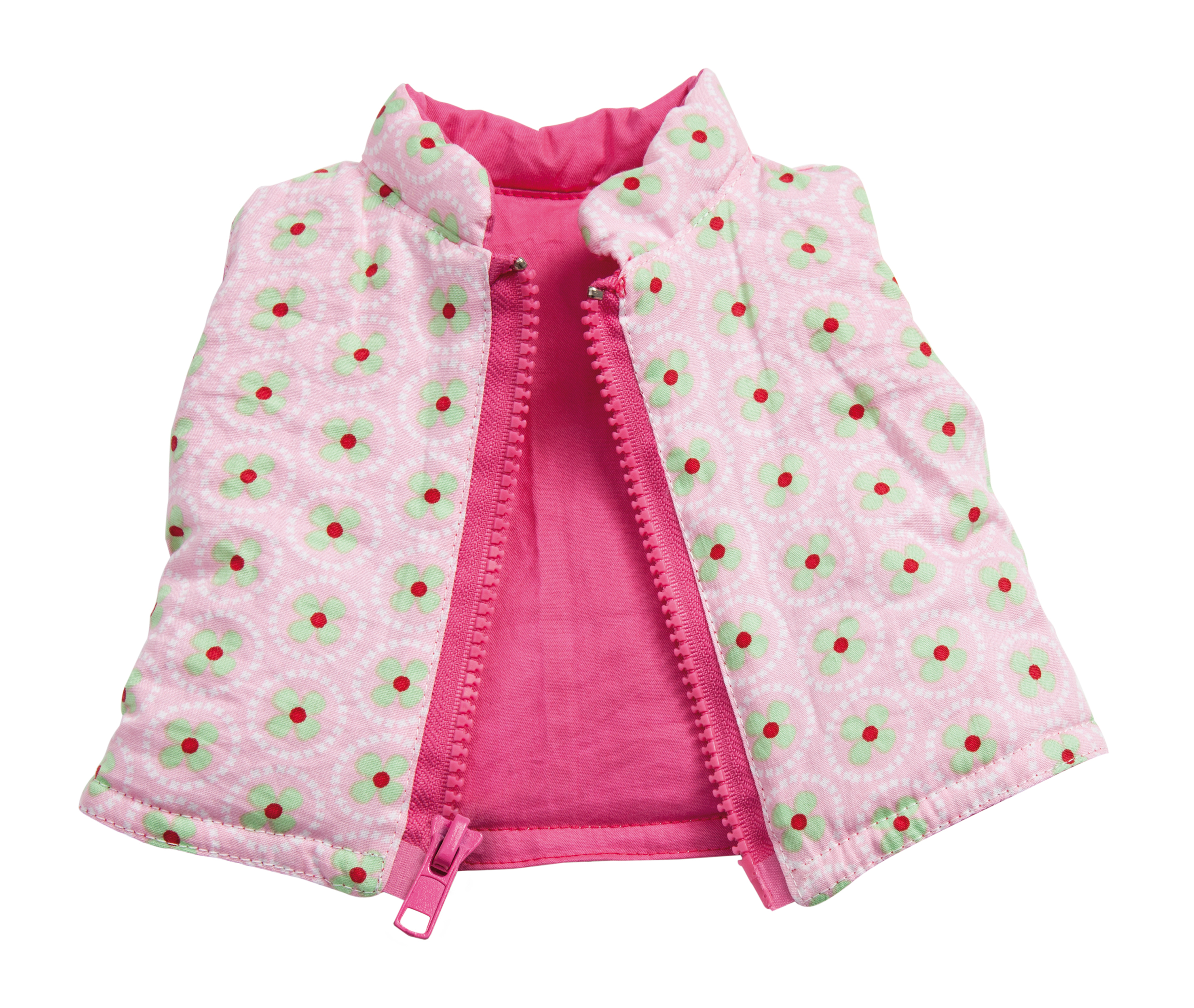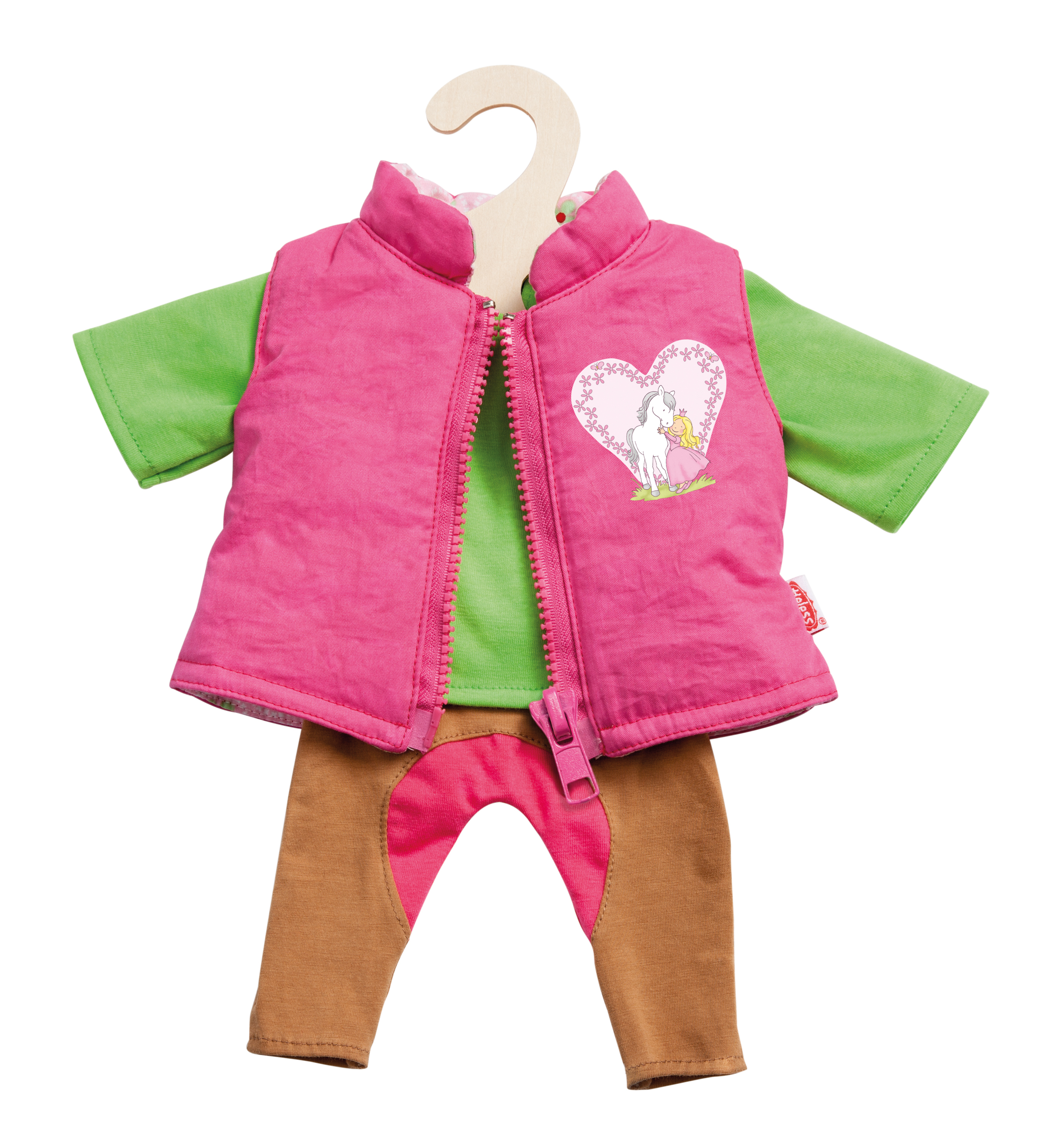 Mit dem modischen Puppen-Reiteroutfit von Heless ist die Puppe für alle Reitausflüge bestens gerüstet. Das 3-teilige Set mit seinen frischen, perfekt aufeinander abgestimmten Farben besteht aus einer hochwertig wattierten Wendeweste mit niedlichem Pferdedruck auf der einen und einem farbenfrohen Blumendruck auf der anderen Seite. Dazu gehört ein grünes Shirt sowie eine optisch dem Original nachempfundene Reithose. Der durchgehende Reißverschluss der Wendeweste, der Klettverschluss am Shirt sowie das elastische Material der Hose machen das An- und Ausziehen der Puppe kinderleicht. Dieses Set passt den meisten marktgängigen Puppen der Größe 28 - 35 cm. Es ist auch in einer weiteren Ausführung für Puppengröße 35 - 45 cm erhältlich. Der Artikel wird auf einem Holzkleiderbügel geliefert.