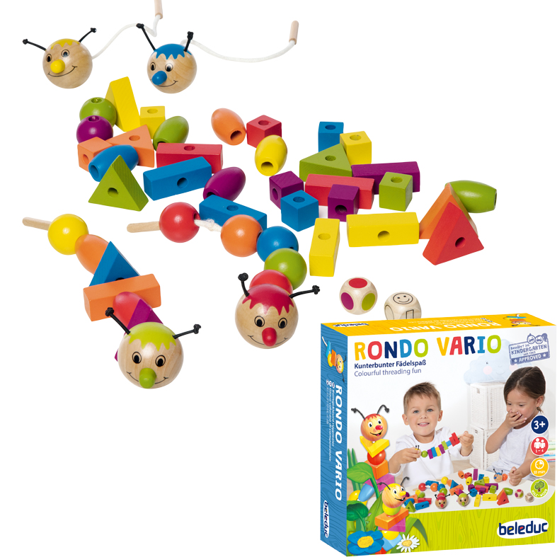 Die Kinder müssen die richtige Form und Farbe zwischen den Holzteilen finden. Die beiden Würfel zeigen die Kombination für die Figur, die auf der Raupe aufgezogen werden soll. Der erste, der seine Holzstücke auf die Raupe hängt, ist der Gewinner!