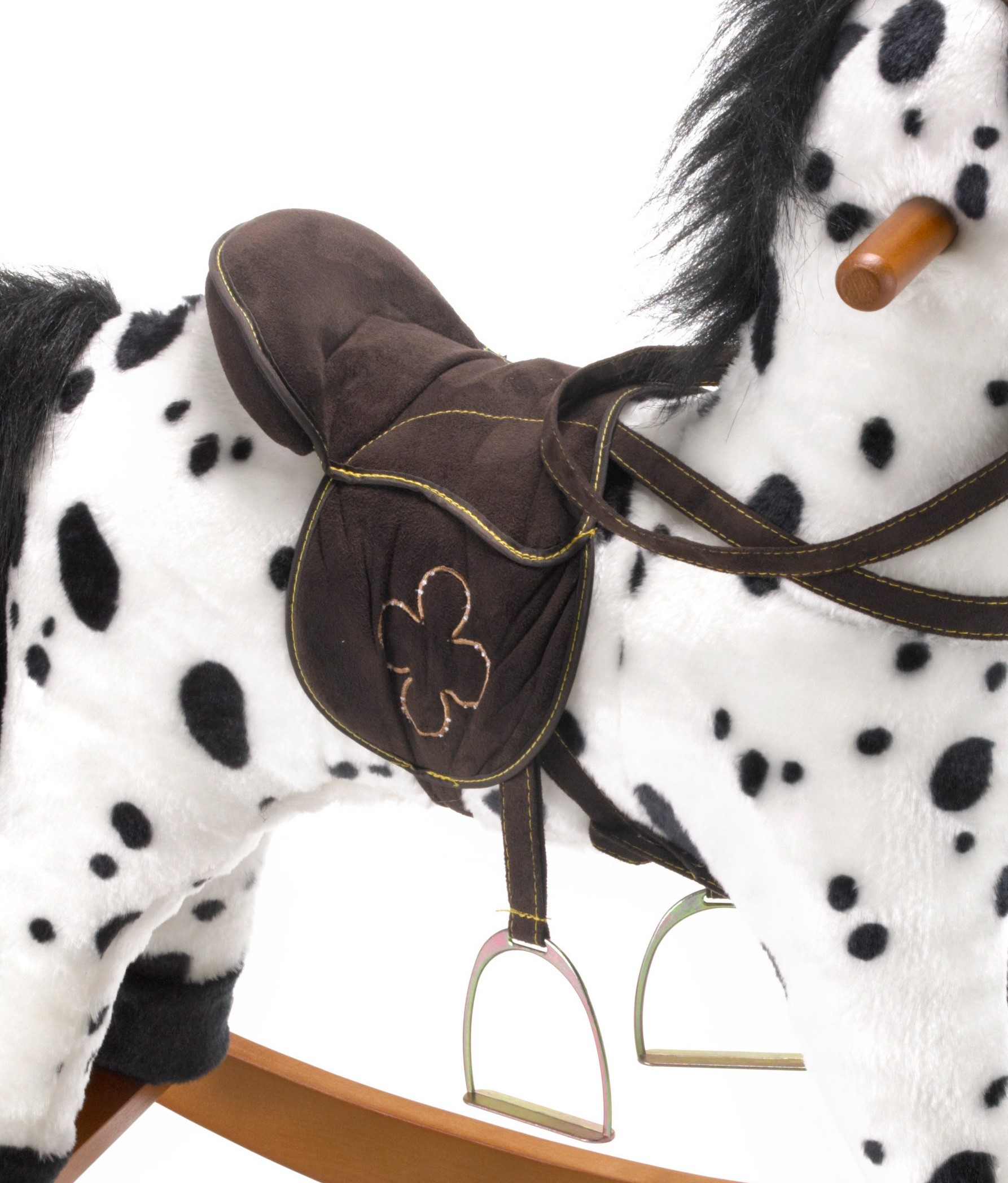 Das niedliche Schaukelpferd von Bayer CHIC 2000 aus weichem Stoff und mit modernem Sattel bietet durch seine stabilen Steigbügel und die Holzgriffe idealen Halt bei wilden Ausritten im Galopp. Durch Druck auf die Pferdeohren ertönt ein Wiehern und ein Galoppgeräusch. Für besonders wilde Ausritte bieten der stabile Rahmen und die Zügel Sicherheit für den Reiter. Damit sich die kleinen Reiter nicht wehtun, sind alle Kanten abgerundet. Es wird fertig montiert geliefert, lediglich die Haltegriffe und die Schaukelvorrichtung müssen angebracht werden. Schrauben und eine Aufbauanleitung sind in der Lieferung enthalten. Die Sattelhöhe beträgt ca. 46 cm. Das Schaukeltier ist für Kinder ab 18 Monaten geeignet. Artikelmaße: 75 x 30 x 71 cm, Gewicht: 3,8 kg