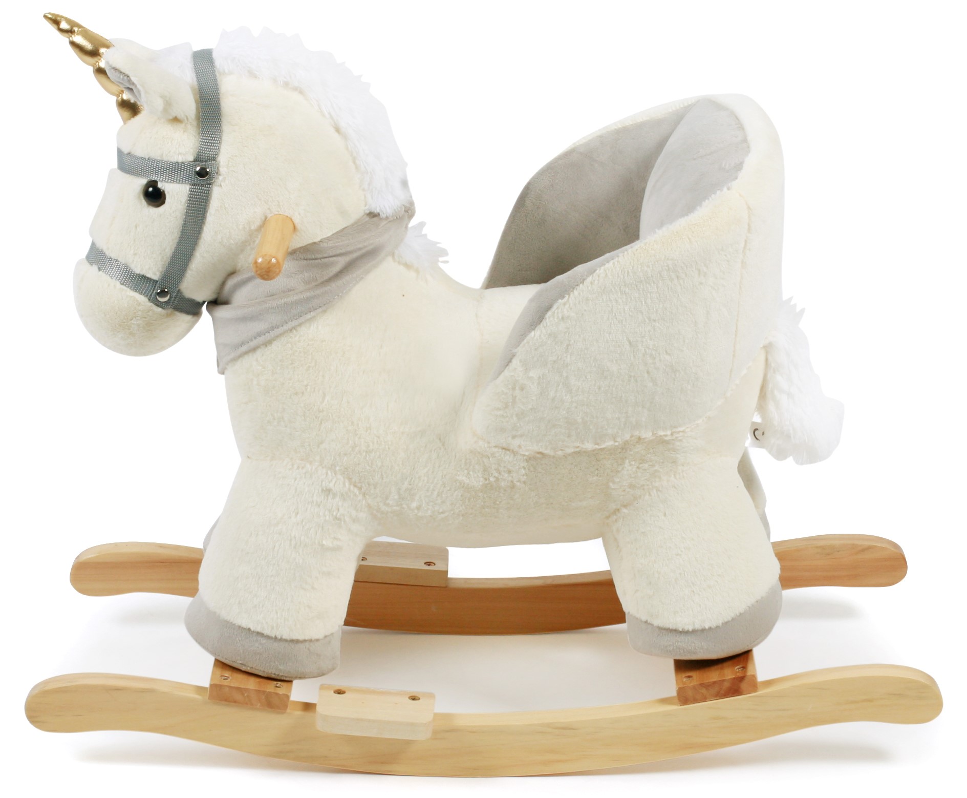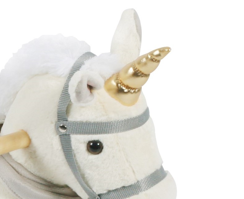 Das schicke Schaukel-Einhorn in neutralen beige-grauen Farbtönen mit goldenem Einhorn besteht aus weichem, kuscheligem Plüsch und das Schaukelelement aus Massivholz. Durch den komplett gepolsterten Sitz mit hohem Rücken und Seitenteilen schaukeln schon die ganz Kleinen sicher und gemütlich. Geeignet für Kinder ab 18 Monaten. Gewicht: 3 kg / Artikelmaße: 70 x 33 x 55 cm / Sitzhöhe: 32 cm