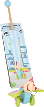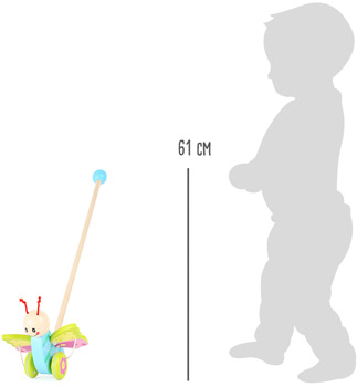 Flieg Schmetterling, flieg! Mit diesem Schiebetier kann das Kinderzimmer wunderbar erkundet werden. Beim Drehen der Rollen flattert der Schmetterling mit seinen Flügeln umher. Der Schiebeschmetterling ist aus stabilem Holz gearbeitet und der praktische Griff bietet guten Halt beim Schieben. Die Rollen sind mit einer Gummierung ausgestattet, die ein leises und sicheres Gleiten über dem Boden garantieren. Ein Muss für jedes Kinderzimmer!