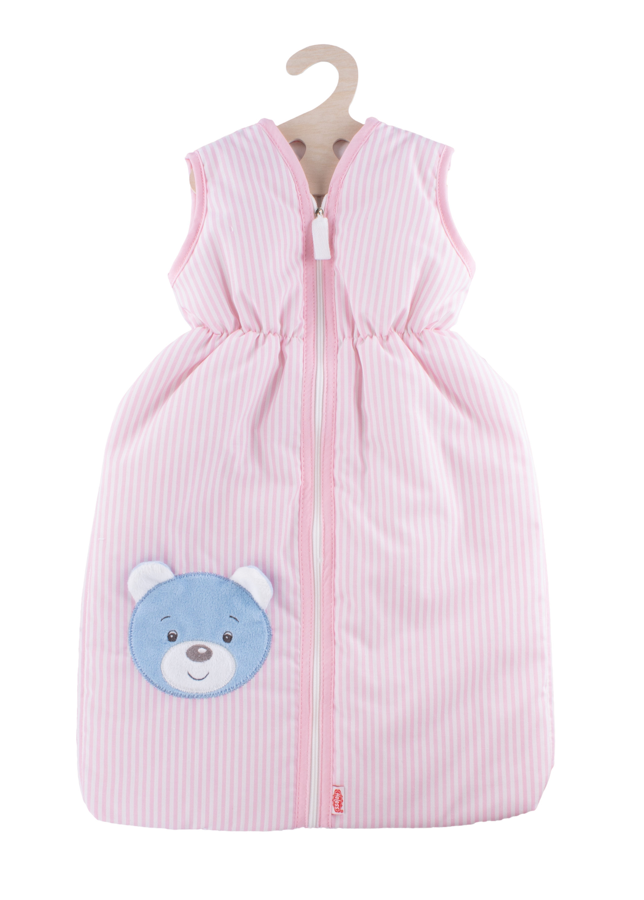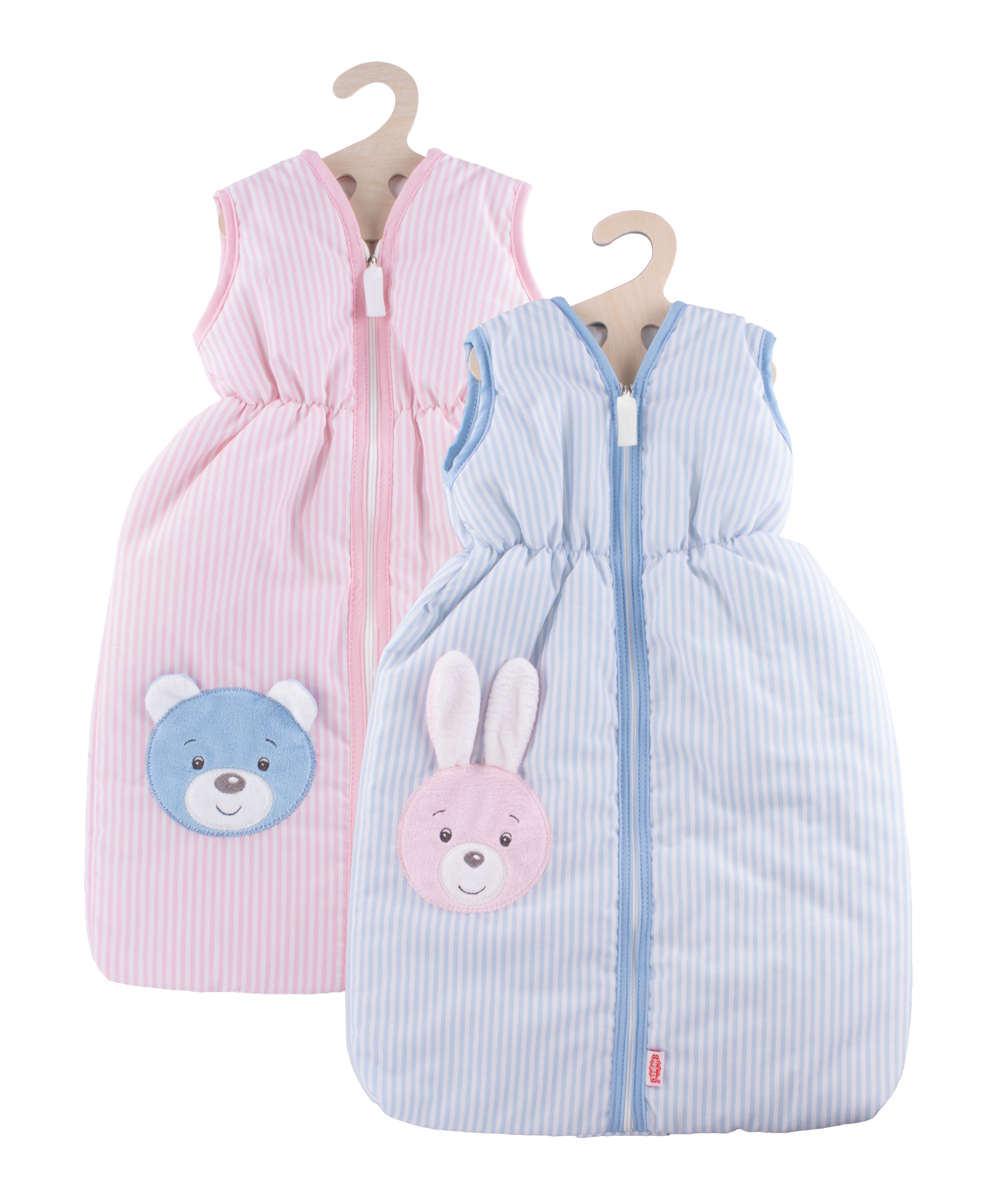 Der weich wattierte Puppenschlafsack von Heless sorgt für besonders kuschelige Puppenträume. Er ist in den Farben rosa-weiß gestreift und hellblau-weiß gestreift erhältlich und mit einer hochwertigen und kuschelweichen Plüschapplikation mit Bestickung - entweder als Bär oder als Hase - versehen. Der Puppenschlafsack wird mit einem praktischen Reißverschluss in der Mitte geschlossen bzw. geöffnet. So ist es kinderleicht, die Puppe für die Nacht oder den Mittagsschlaf warm einzupacken. Der Schlafsack hat eine Länge von 37 cm und passt den meisten marktgängigen Puppen der Größe 28 - 35 cm. Der Artikel wird auf einem Holzkleiderbügel geliefert und ist ebenfalls in den Längen 50 cm und 22 cm erhältlich.