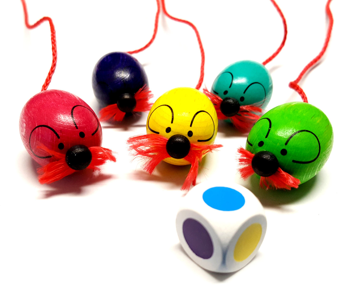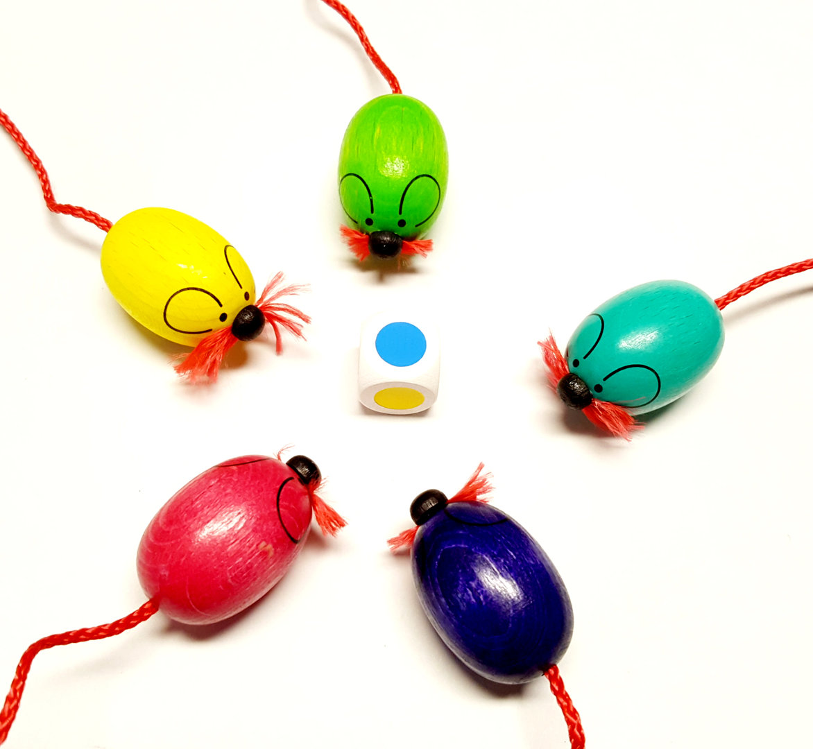 Lustiges Schnelligkeitsspiel mit 5 bunten Mäusen und einem Würfel aus Buchenholz.
