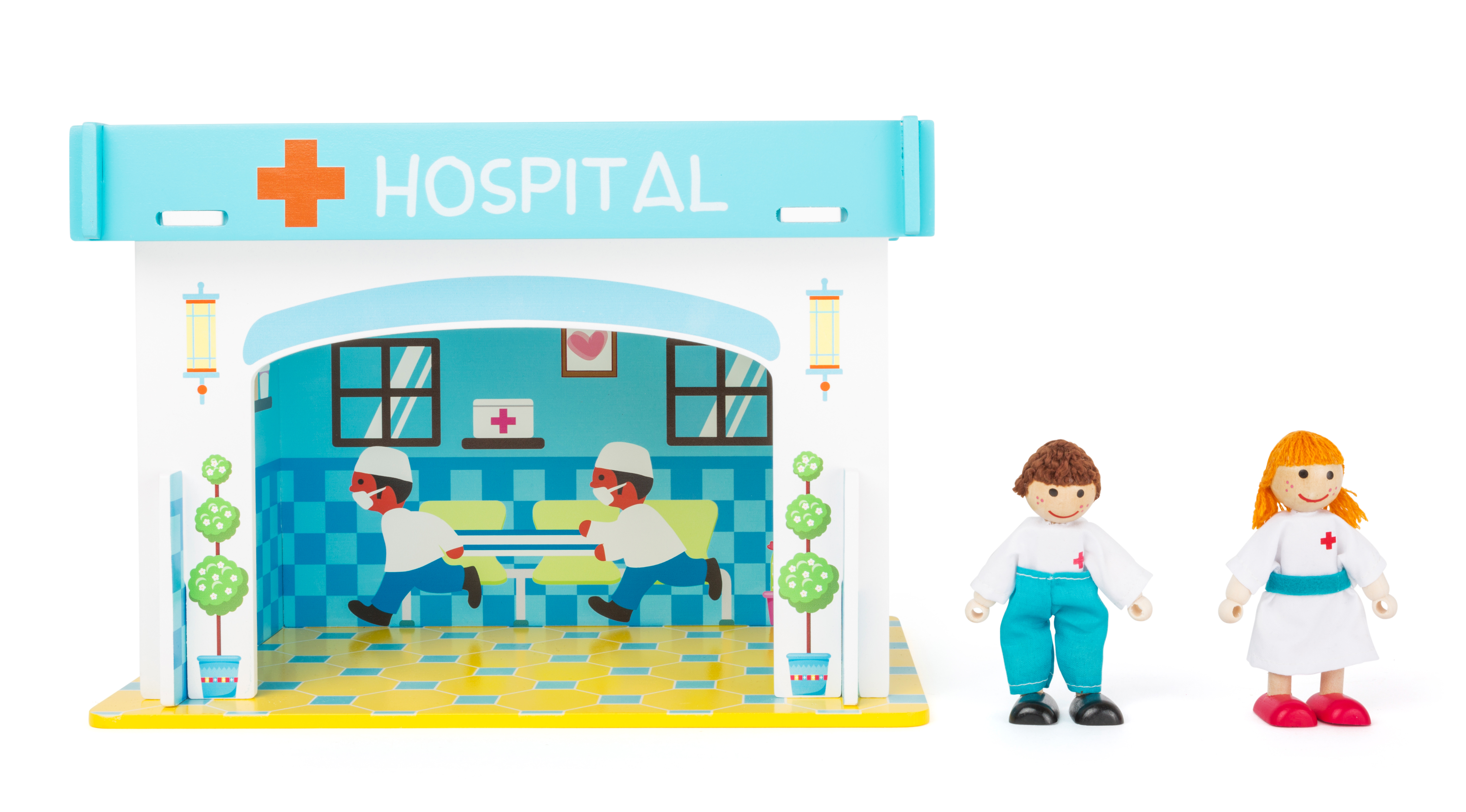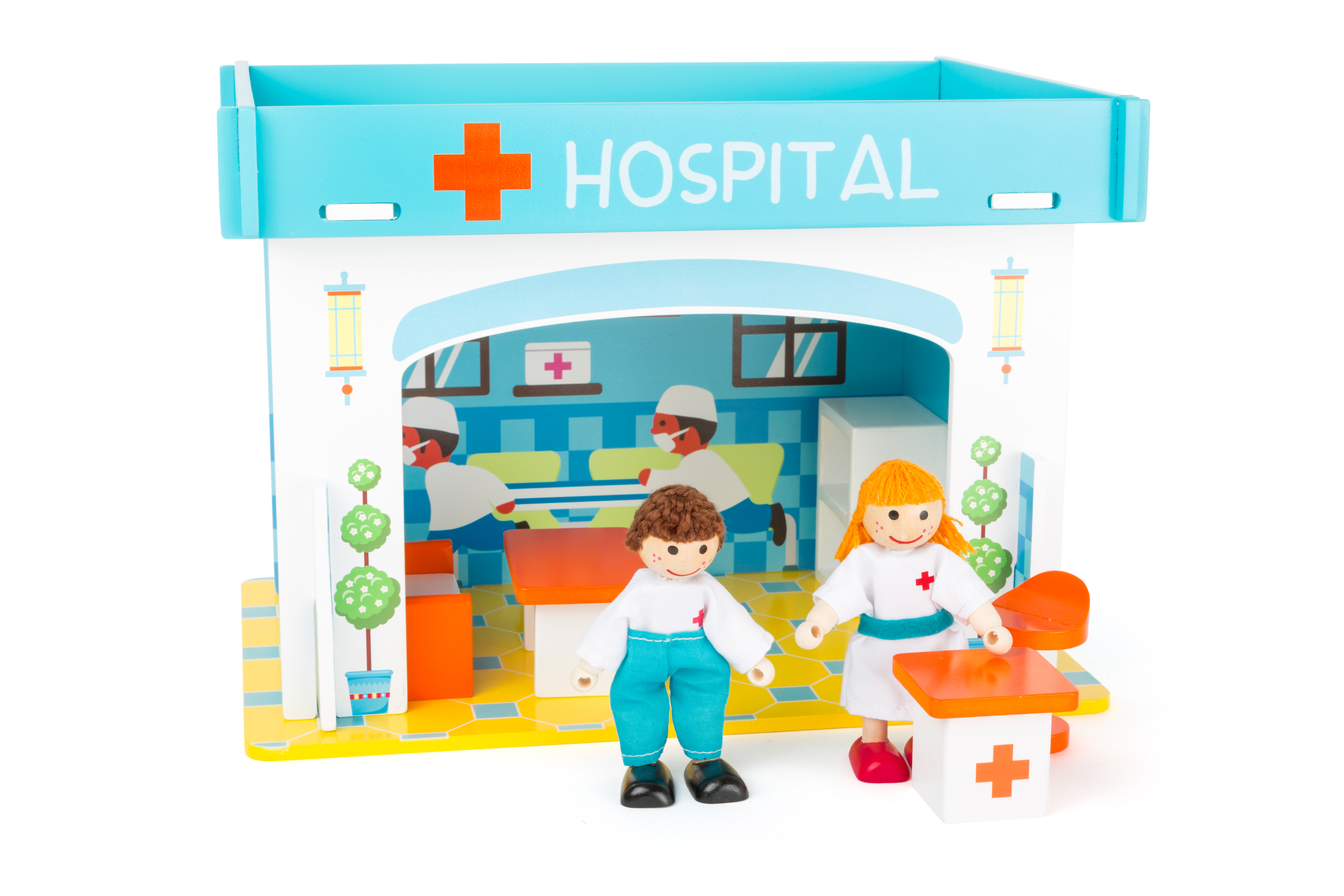Knie kaputt und eine Beule? In diesem Hospital aus robustem Holz wird garantiert jeder kleine und große Patient wieder ganz schnell gesund! Ärzte und Pfleger sind im Lieferumfang bereits enthalten und sind bereit für kleine und große Operationen. Die vier Wände und das Dach aus robustem Holz werden kinderleicht zusammengesteckt und sorgen immer wieder neu für fantasievolles Spielvergnügen.