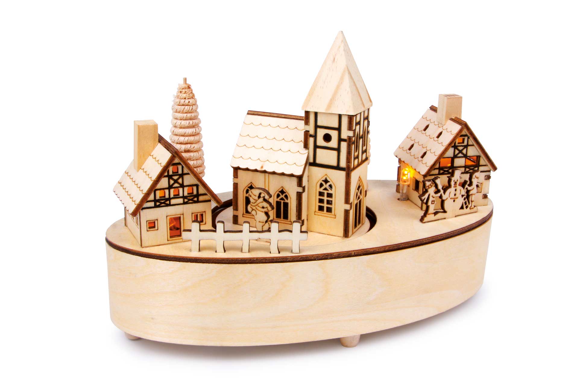 Die zauberhafte Winterkulisse aus detailliert gearbeitetem Sperrholz lässt zarte weihnachtliche Musik erklingen und die Kirche dreht sich zu „Stille Nacht“. Gelbe LED-Lämpchen in den Häuschen bringen sanftes Licht in den Raum! Batterien nicht enthalten.