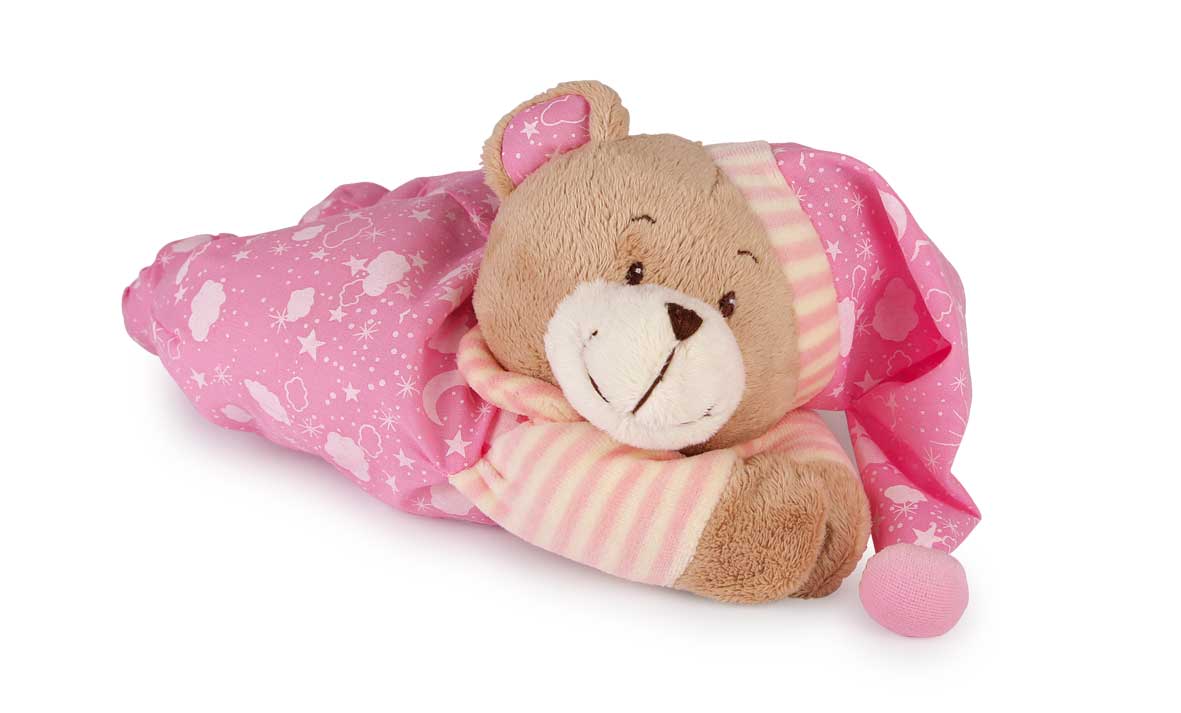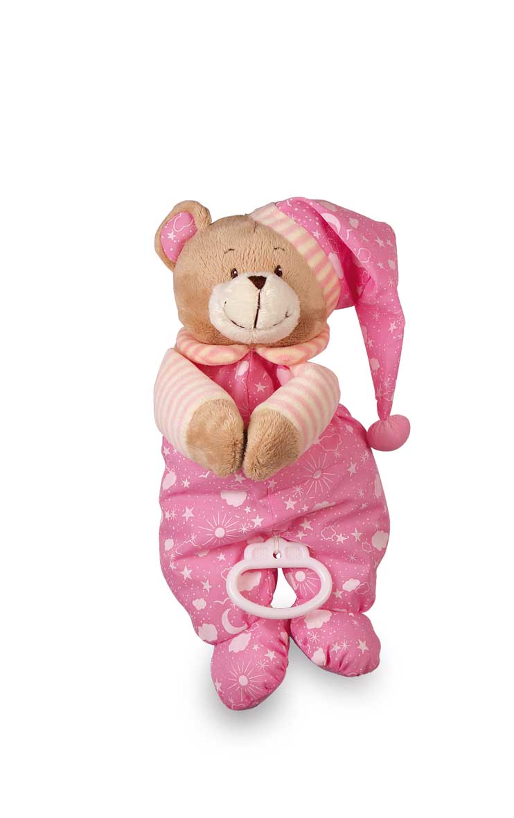 Sanfte Träume bringt das weiche Bärchen im rosa Schlafanzug! Beim Abspielen wünscht er seinen Zuhörern „Guten Abend, gute Nacht“! Zum Aufhängen sind zwei weiche Bänder angenäht.
