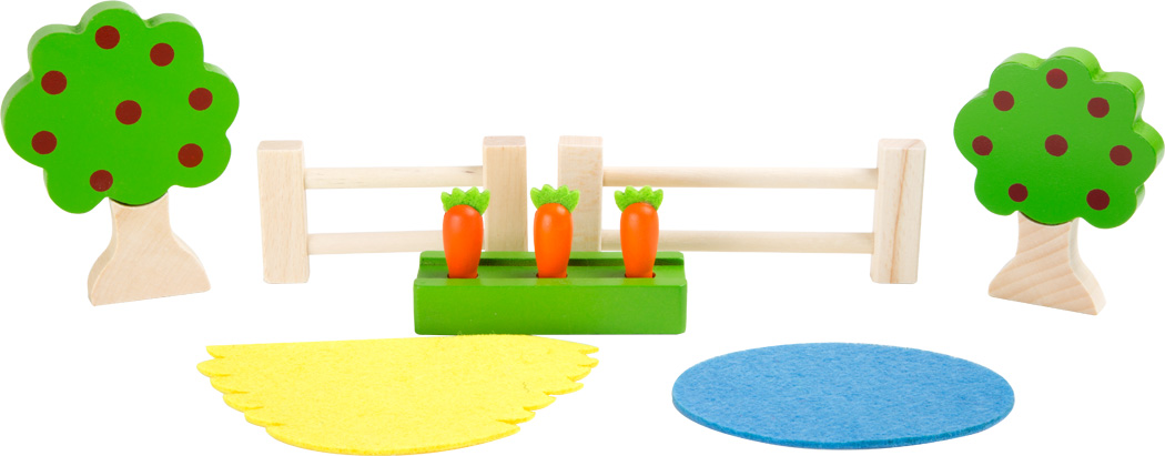 Inhalt: 1 Bauernhof, 2 Baum, 2 Zaun, 1 Möhrenbeet, 1 Heu, 1 Teich, 2 Bauer, 6 Tiere