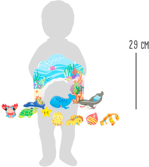 Blubb blubb - wer kommt denn da vorbeigeschwommen? Mit dieser Spielwelt lassen sich aufregende Unterwasser-Abenteuer erleben! Der farbenfrohe Hintergrund aus Holz und die praktische Bodenpappe lassen die Kids im Handumdrehen eintauchen in spannende Tiefseegeschichten. Die zehn süßen Meeresbewohner aus lackiertem Holz liegen gut in der Hand und regen die Phantasie an. Mit dieser Spielwelt lassen sich tolle Geschichten erzählen! Ein spannendes, abwechslungsreiches Spiel, das garantiert nie langweilig wird!