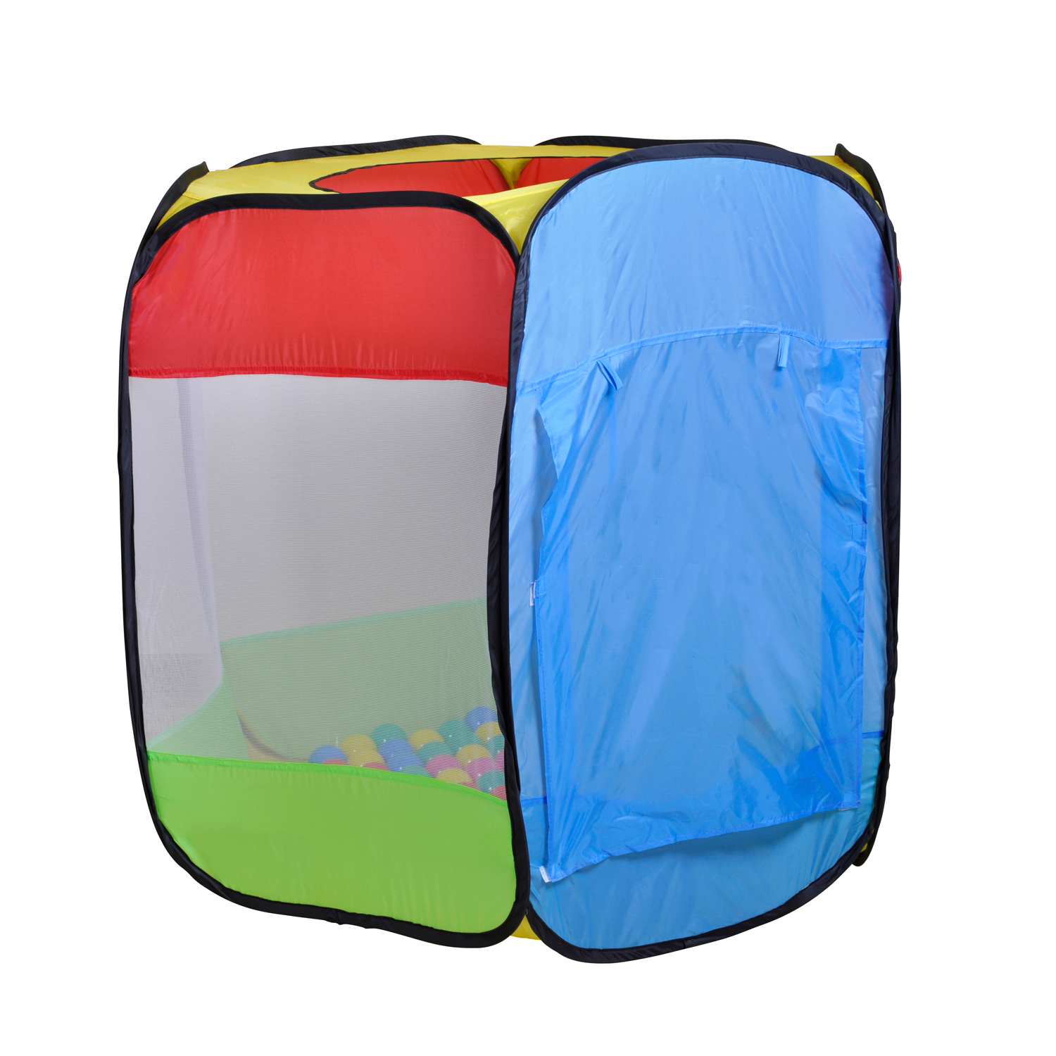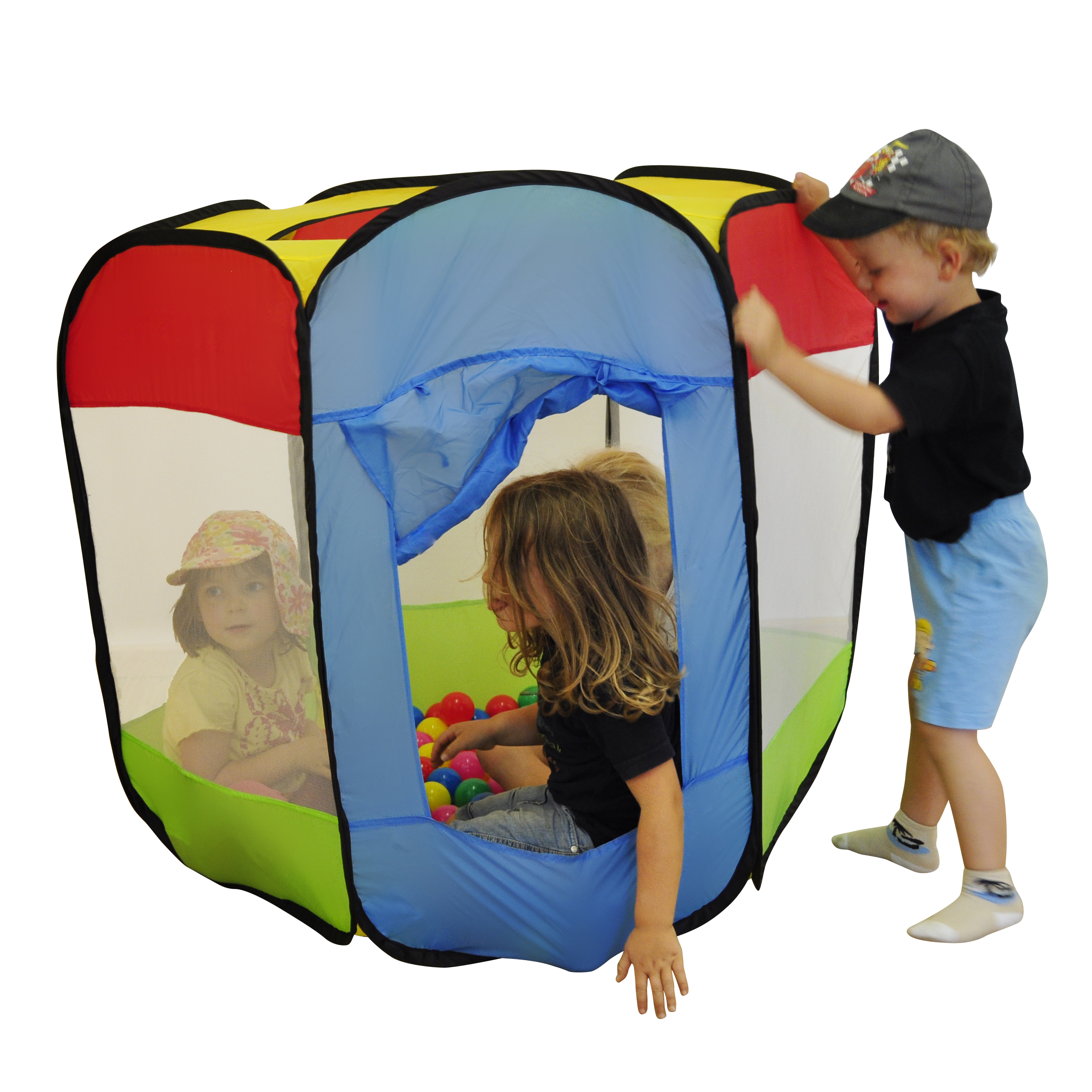 Dieses bunte sechseckige Spielzelt mit 100 verschiedenfarbigen Bällen von Knorrtoys ist vielseitig einsetzbar und verspricht riesigen Spielspaß. Hand-Augen-Koordination und sensorische Fähigkeiten werden im Spiel mit Bällen gefördert. Der Eingang kann mit Bändern offengehalten werden. Dank der Seitenwände aus Gaze haben die Kids auch während des Spielens den vollen Durchblick. Das Zelt besteht aus wasserabweisendem Zeltstoff und ist abwischbar. Abmessungen: Ø ca. 110 cm und ca. 98 cm hoch; Bälle: Ø 6 cm