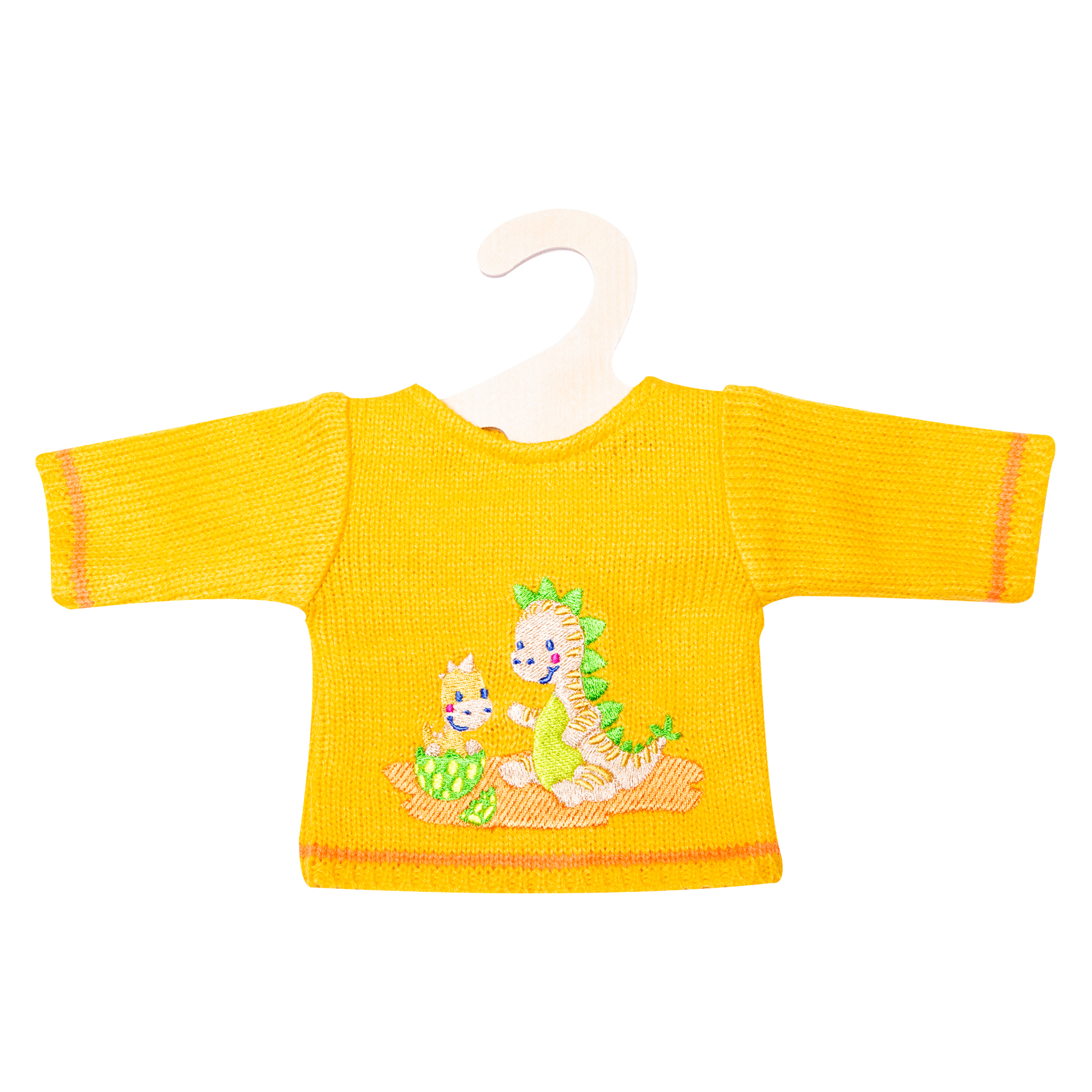 Die Dinos sind los - und erobern nun auch die Puppengarderobe. Der Strickpullover mit Hose "Dino" von Heless ist ein dinostarkes Outfit, mit dem die Puppe auch an kälteren Tagen einen absolut lässigen Auftritt hat. Der Strickpulli mit niedlicher Bestickung zeigt ein frisch geschlüpftes Dino-Baby mit seiner Mama. Auf der gemütlichen Hose mit Allover-Print tummeln sich noch weißere süße Dinos, die einem allesamt das Herz erwärmen. Der elastische Hosenbund und der durchgehende Klettverschluss des Strickpullis sorgen dafür, dass das Outfit kinderleicht an- und ausgezogen werden kann. Ein dinostarkes Bekleidungsset für alle, die die kleinen Urzeitechsen lieben. Dieses Outfit passt den meisten marktgängigen Puppen der Größe 28 - 35 cm. Es ist auch in einer weiteren Ausführung für Puppengröße 35 - 45 cm (Art.-Nr. 2134) erhältlich. Der Artikel wird auf einem Holzkleiderbügel geliefert.