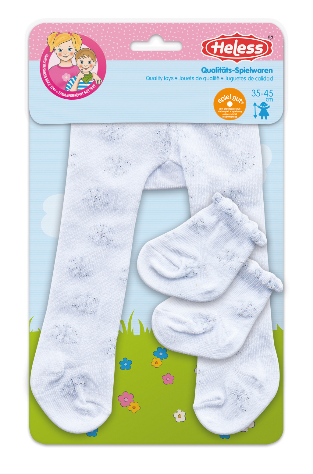 Die beliebte Strumpfhosen- und Söckchen-Kollektion von Heless gibt es nun in drei weiteren Designs. Ob in der Version komplett Gold, in weiß mit goldenen Pünktchen oder mit filigranen silbernen Eiskristallen versehen: Die neuen Puppenstrumpfhosen und Puppensöckchen passen zum schicken Festkleid genauso gut wie zum legeren Lieblingsrock und verleihen jedem Puppenoutfit das gewisse Etwas. Die Strumpfhosen und Söckchen sind aus hochwertigem, elastischem Material gefertigt und können somit unterschiedlichsten Puppen kinderleicht an- und ausgezogen werden. Eine gute Passform lässt auch für Windeln genug Platz. Tolle Basic-Artikel, die in keinem Puppenkleiderschrank fehlen dürfen. Dieses Set passt den meisten marktgängigen Puppen der Größe 35 - 45 cm. Es ist auch in einer weiteren Ausführung für Puppengröße 28 - 35 cm erhältlich.