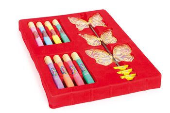 Leuchtend bunte Schmetterlingsflügel werden mit Hilfe der sechs Schablonenpaare und den Körpern gestaltet! Drei Metallstangen halten je einen der wunderschönen Flieger und drei kleine Klammern die anderen. Vier der acht enthaltenen Farben haben glitzernde Partikel für schöne Lichtreflexe!