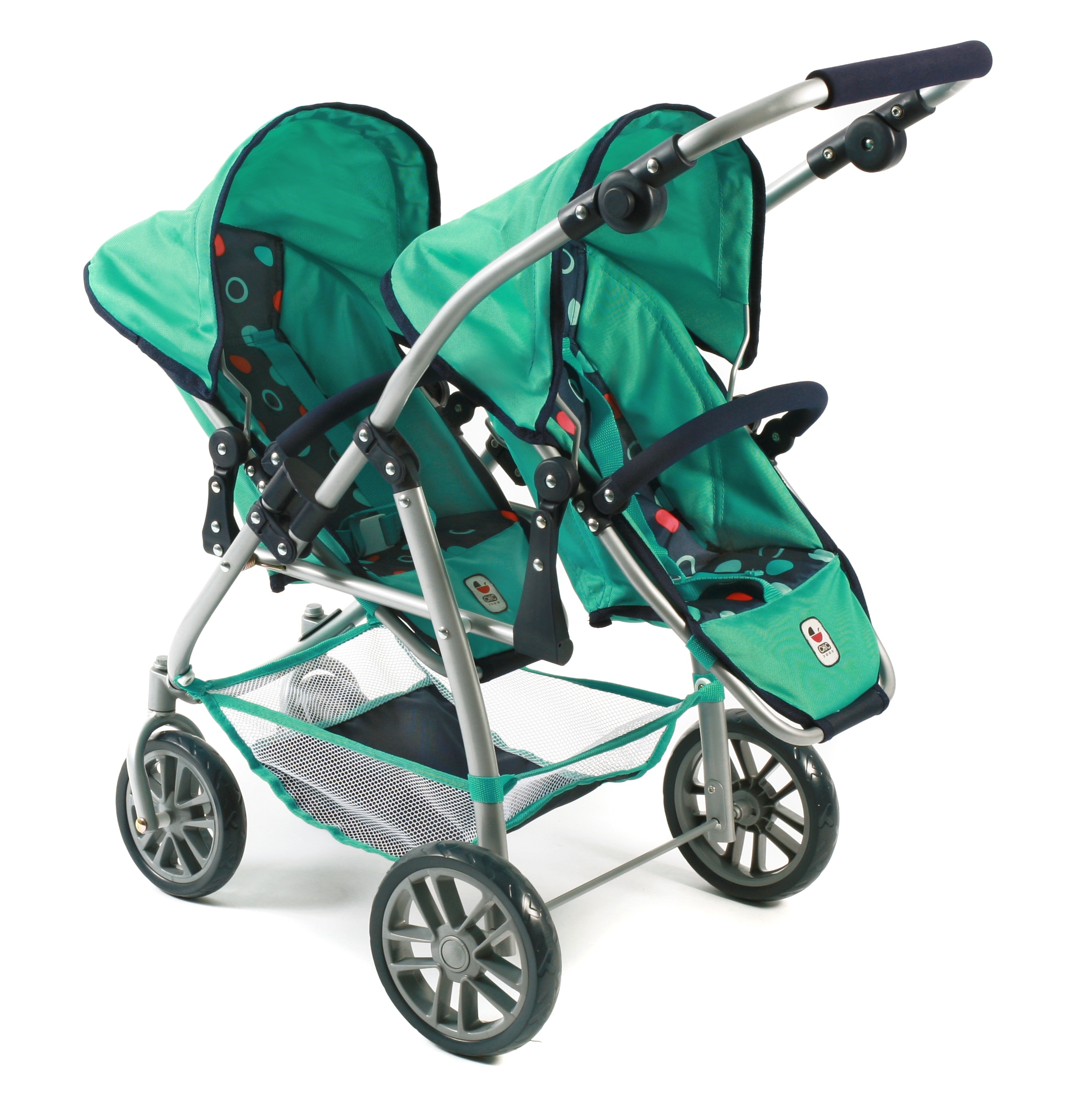 Moderner Zwillings-Sportwagen mit zwei abnehmbaren und bis in Liegeposition verstellbaren Sportsitzen, die beide sowohl in Fahrrichtung wie auch mit Blick zur Puppenmutti aufgesetzt werden können oder auch Face to Face. Daraus ergibt sich eine Vielzahl an Kombinationsmöglichkeiten für die Puppenmutti. Kurven fahren wird zum Kinderspiel aufgrund der schwenkbaren Vorderräder. Der höhenverstellbare Schiebegriff von ca. 55 bis 84 cm passt sich der Körpergröße der Puppenmutti an. Im großen Gepäcknetz kann viel Zubehör mittransportiert werden. Das Gestell kann flach zusammengeklappt werden. Für Puppen bis 50 cm geeignet. Artikelmaße: 71 x 47 x 79 cm; Gewicht: 4,1 kg