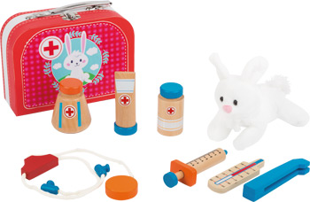 Detailreich gestaltet und aus robustem Holz gefertigt sind Spritze, Fieberthermometer, Pinzette, Stethoskop, Salbe und Tabletten die erste Wahl für alle Haseneltern. Und nun: Häschen, hüpf!