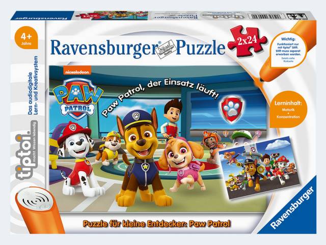 Was ist die Paw Patrol? Welche Hunde gehören dazu? Und welche Einsätze erleben sie? Wenn das Puzzle zusammengesetzt ist, gehen die Spieler mit tiptoi auf Entdeckungsreise und tauchen in die Welt von Paw Patrol ein. Spannendes Wissen über Ryder und die Helfer auf vier Pfoten, sowie lustige Spiele runden das Puzzle-Erlebnis ab. Der Puzzlespaß im Doppelpack mit 2x24 Teilen fördert zudem die Motorik und die Konzentration.
