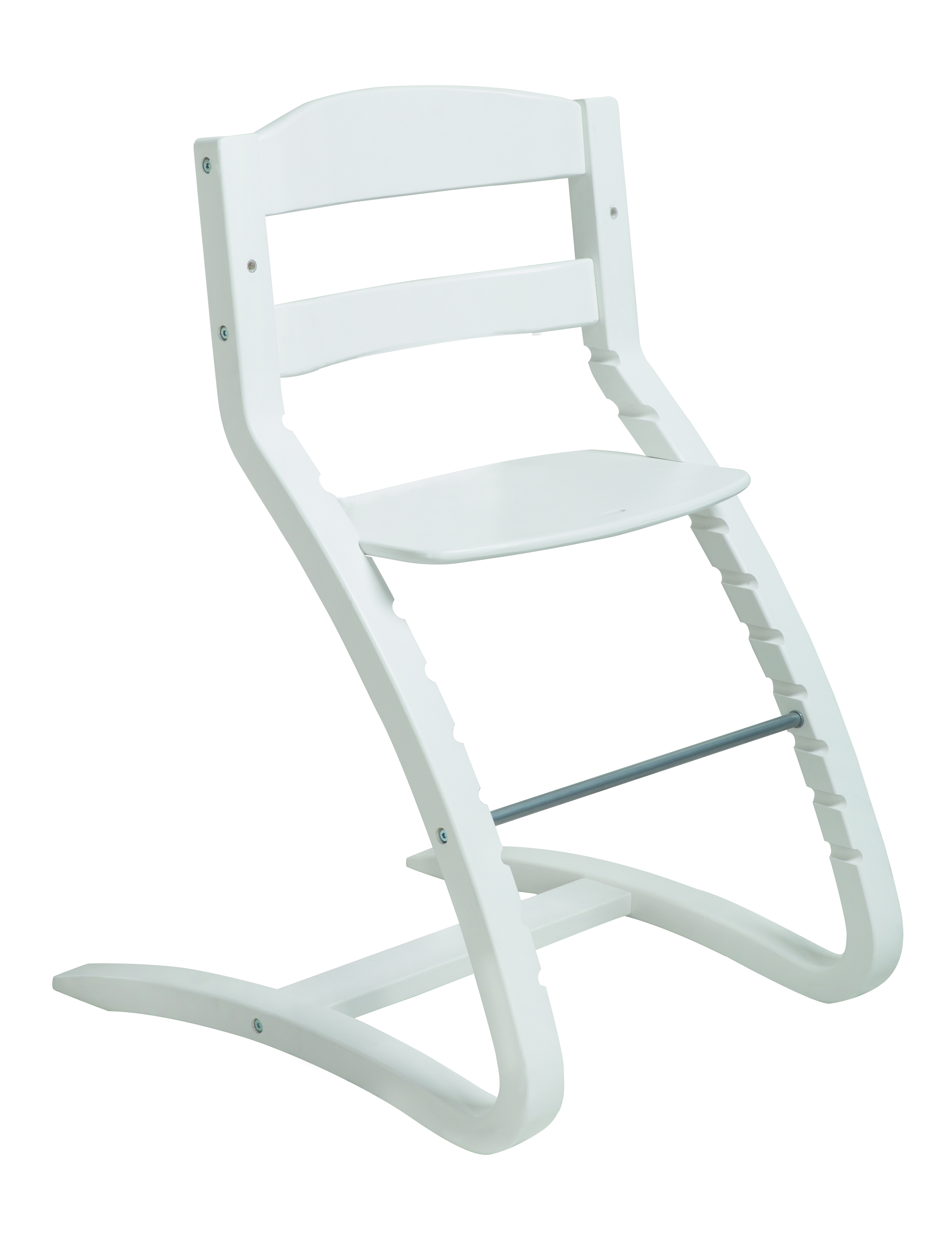 Treppenhochstuhl "Grow Up", weiß lackiert, Formholz, HxBxT: 80 x 50 x 58 cm, Sitzhöhe max: 56 cm, Sitzhöhe min: 42,5 cm, Gurtsystem, Sicherheitsbügel 2-fach verstellbar, Sitz- und Fußbrett variabel verstellbar, zweigeteilte Rückenlehne aus Formholz, passend dazu erhältlich: Essbrett 0060 und 0060 W