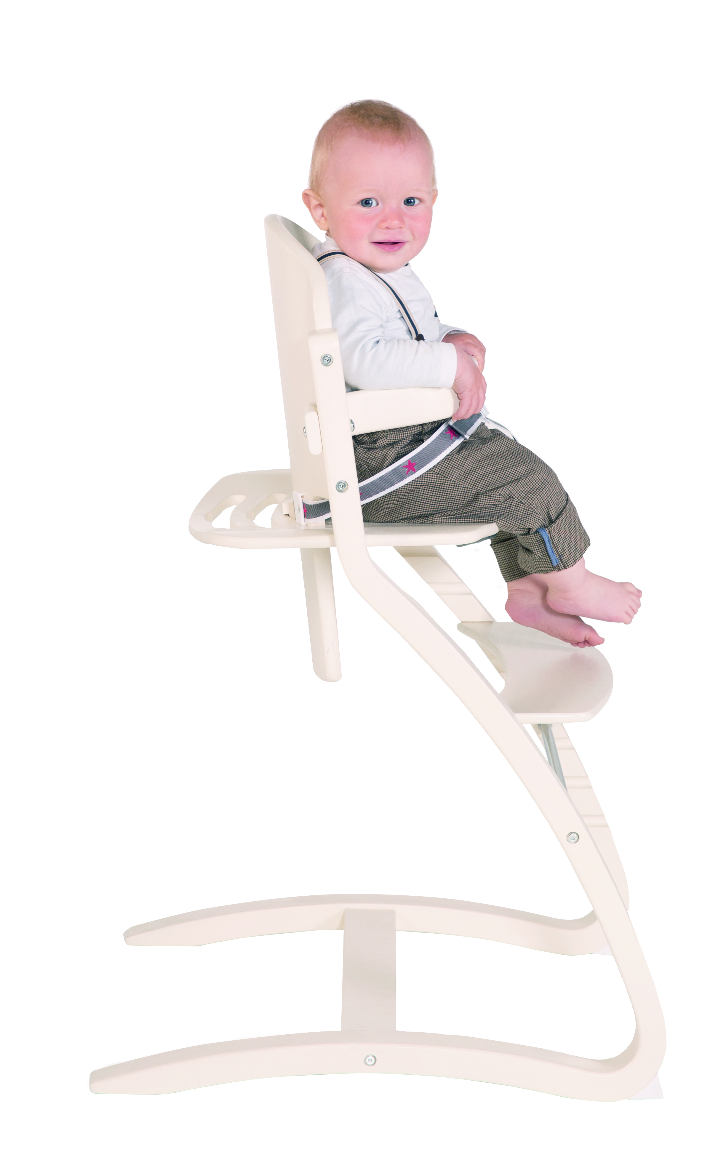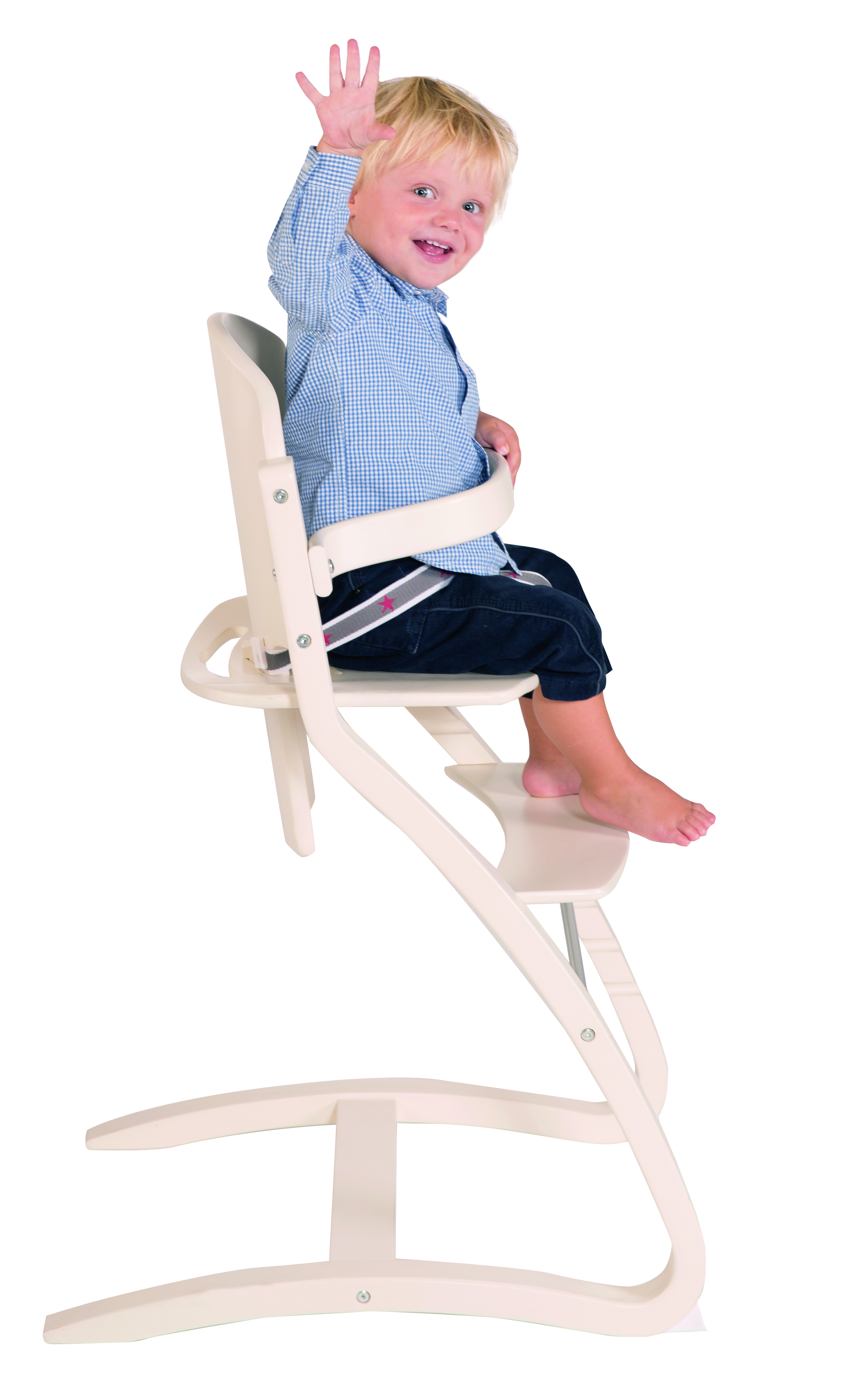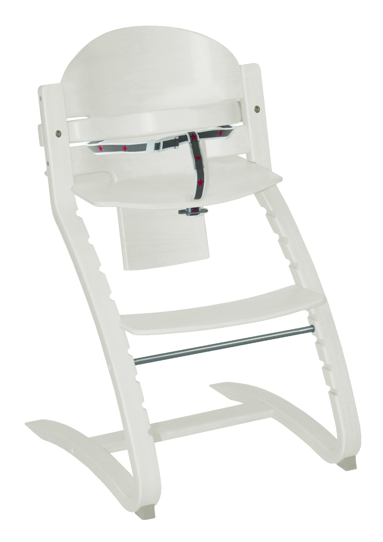Treppenhochstuhl "Move", weiß lackiert, gebogene Formholz-Seitenteile, Sitz und Lehne aus Formholz, Höhe und Tiefe verstellbar, Sicherheitsbügel 2-fach verstellbar, Gesamthöhe: 86 cm, Gurtsystem, Sitzhöhe max. : 56 cm, min. : 42,5 cm, BxT: 50 x 58 cm