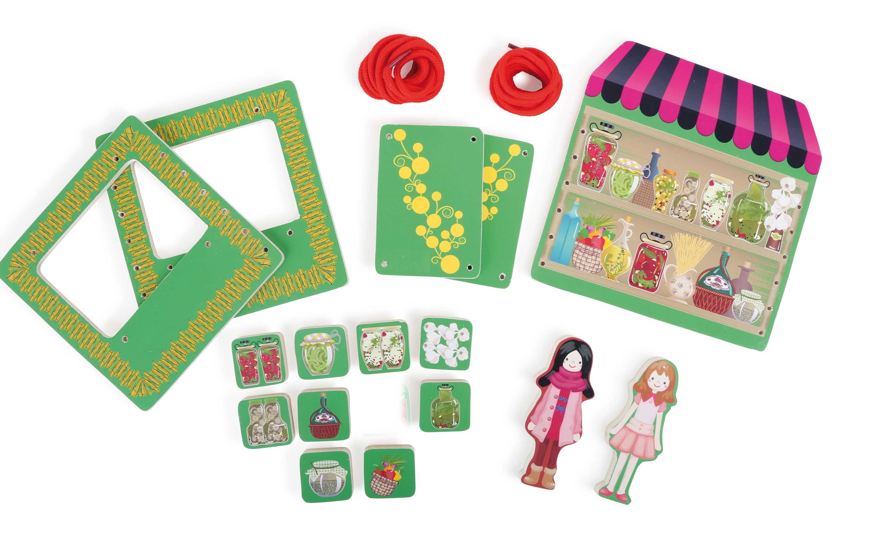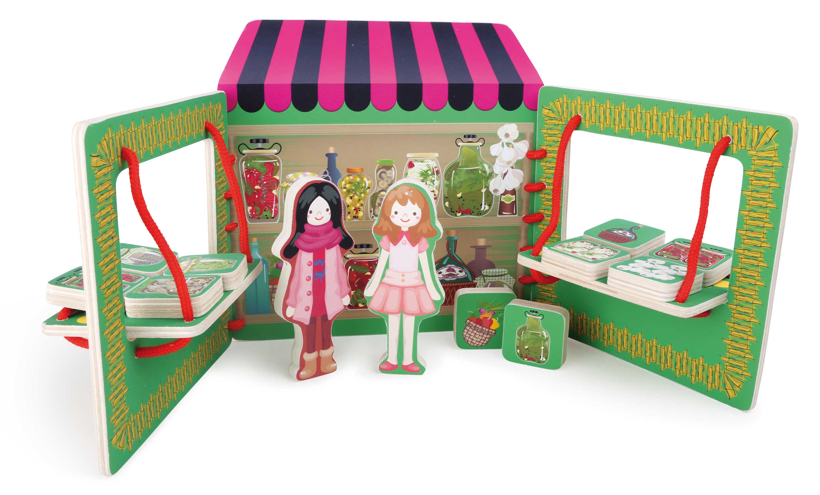 Geschäftiges Treiben am Gemüsestand. Hier verkaufen zwei Standfrauen ihr leckeres, gesundes Gemüse und eingelegte Delikatessen. Der tolle Gemüsestand lässt sich mit den Stützen aufstellen und hat sogar eine kleine Auslage, die mit den mitgelieferten, roten Schnürbändern befestigt wird. So kann das Gemüse geschmackvoll drapiert werden und wenn alles verkauft ist, wird die Klappe einfach geschlossen!