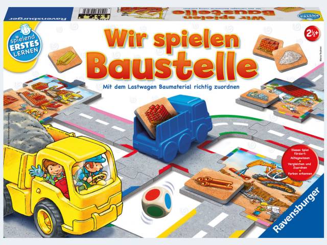 Straßennetz bauen, Lastwagen mit Baumaterial befüllen und zur richtigen Baustelle fahren: Beim Zuordnen und Entdecken der bunten Baustellenwelt lernen Kinder spielerisch Alltagswissen und die Farben kennen. Beim Puzzeln des Straßennetzes zwischen den Baustellen, trainieren die Kids außerdem ihre Feinmotorik. Je nach Entwicklungsstufe der Kinder sind zunächst nur drei, später alle Baustellen zu beliefern. Für ältere Kinder sind Spielvariationen mit ersten Regeln möglich und der Farbwürfel kommt zum Einsatz. „Wir spielen Baustelle“ ist wie alle Spiele der Reihe „Spielend Erstes Lernen“ abgestimmt auf das frühkindliche Erforschen. Alle Spiele dieser Reihe sind mit optimal geeigneten Materialien ausgestattet und unterstützen das große Lernpotenzial der Kleinen.