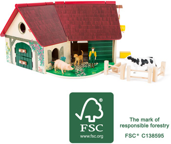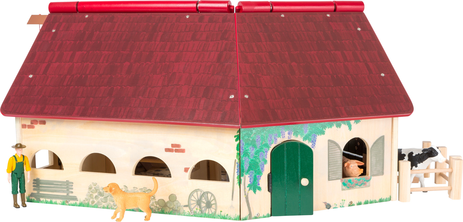 Muhhh - Bauernhofleben der Extraklasse! Diese große Spielwelt aus FSC® 100%-zertifiziertem Holz lässt für kleine Landwirte keine Wünsche offen. Der besondere Charme: Die stabile Holzkonstruktion des Bauernhofs ist in einer auffallenden Winkelform angeordnet und mit einem aufklappbaren Dach ausgestattet. So kann die Farm ganz bequem bespielt werden. Die kindgerecht gestalteten Tiere lassen Kinderaugen leuchten. Die schwarz-weiß gefleckte Kuh und das rosige Schwein finden ihren kuscheligen Platz in zwei Boxen im Stall, die mit Schiebetüren ausgestattet sind. Der Hofhund hält die Augen offen und der Bauer schaut auf dem Heuboden nach dem Rechten. Er legt mit dem beweglichen Flaschenzug immer wieder neue Heu- und Strohballen nach. So werden garantiert alle Tiere satt. Die detailverliebte Gestaltung des Bauernhofes animiert zum realistischen Spiel - da sind der Fantasie keine Grenze gesetzt. Die geteilten Türen des Bauernhofs bieten so viel Platz, dass der Traktor (Art. 11006) bequem hindurch fahren kann, um zu parken. Für kleine Entdecker gibt es rund um den Hof viele filigran aufgemalte Details wie Blumen, eine Bank, eine Gießkanne, ein Vogelnest und sogar eine Maus zu entdecken. Fast wie auf dem echten Bauernhof! Hund, Kuh, Schwein, Bauer und Heuballen sind im Lieferumfang enthalten.